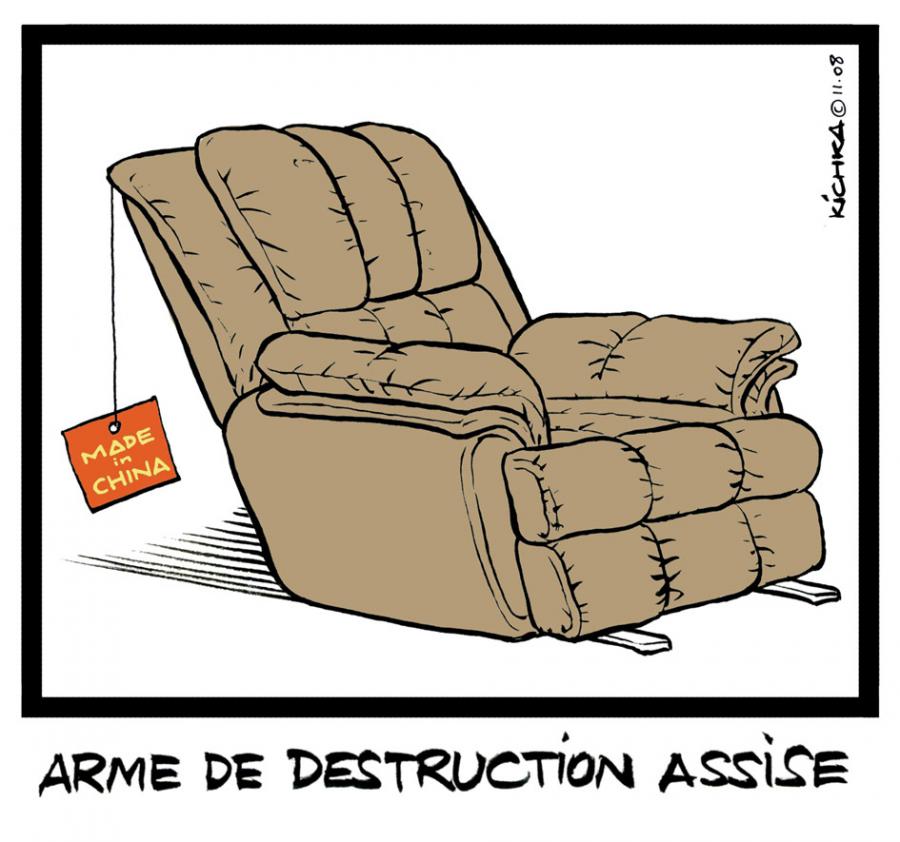 Fauteuils empoisonnés et jouets toxiques. Une concurrence déloyale basée sur des prix imbattables calculés sur base de matériaux interdits et dangereux. Un capitalisme gargantuesque « Made in China ». Le slogan de marketing « Tout ce que vous pouvez faire, je peux le faire meilleur marché » devrait s’additionner de « et encore plus nocif et plus merdique ».