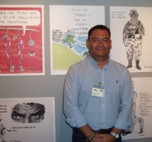 Mheo est diplomé en Sciences Po. Ses cartoons, dessinés à l’arraché, sont relevés de commentaires féroces. Il dit que la Colombie vit refermée sur elle-même, les seuls à voyager étant les élites. Le jour des 20 ans de la chute du Mur de Berlin, il a dessiné un guerilla lisant le journal en s’exclamant: « Merde! Le Mur est tombé? »