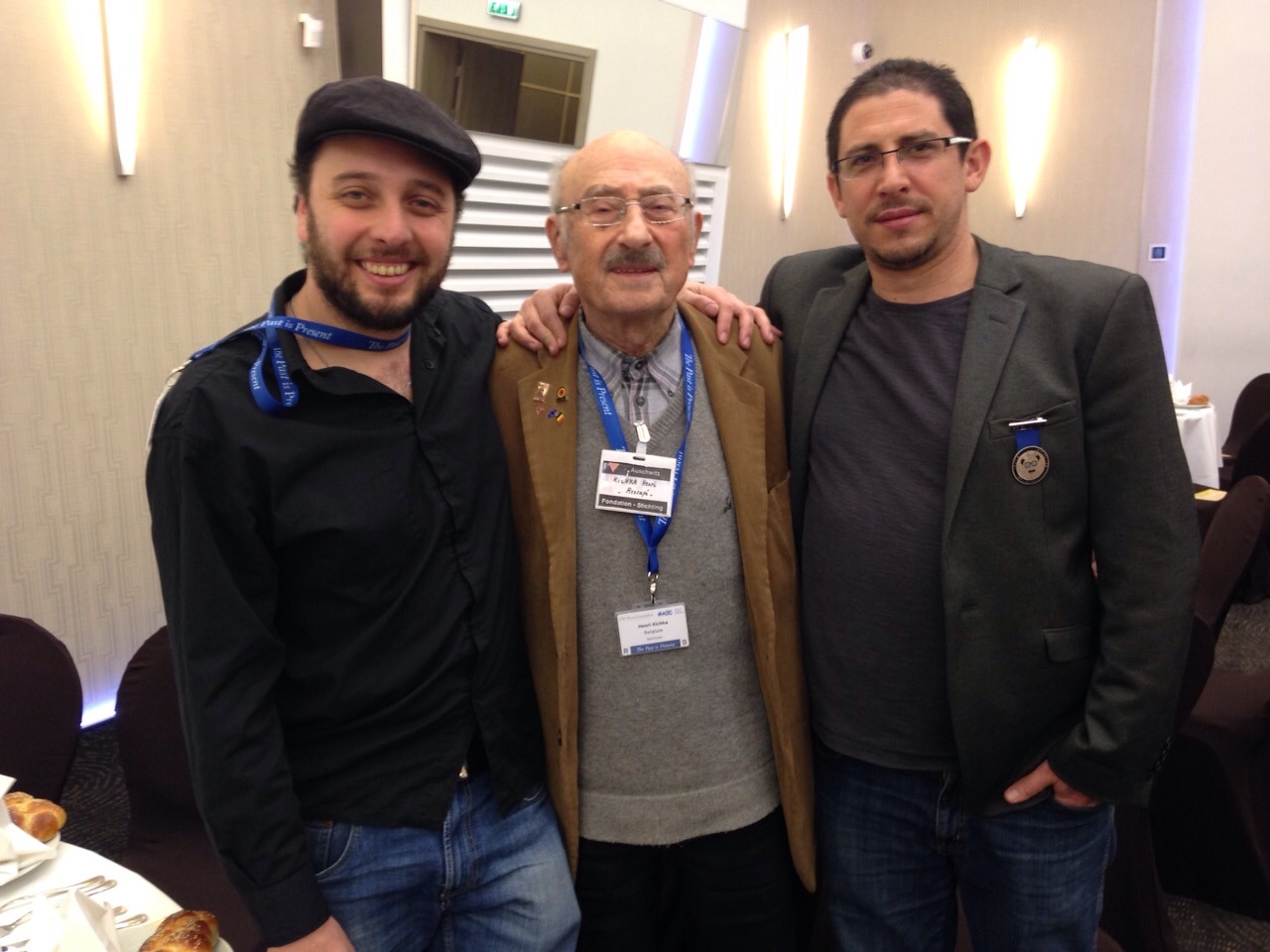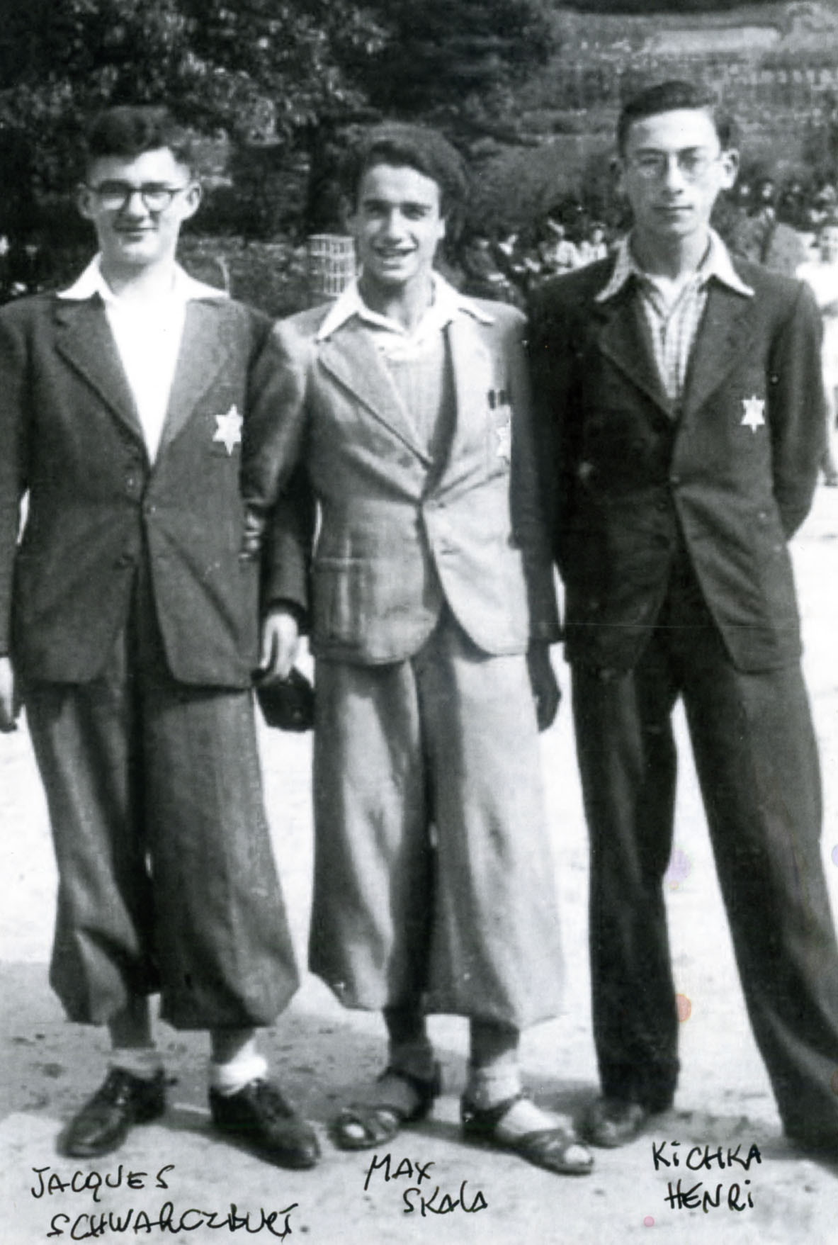 Je joins deux photos: une de mon père et ses deux meilleurs amis Max et Jacques revenus comme lui de l’enfer concentrationnaire, prise à Bruxelles en 1942, quelques mois avant leur déportation. Et une de mon père entre David et Sacha en partance pour Auschwitz.