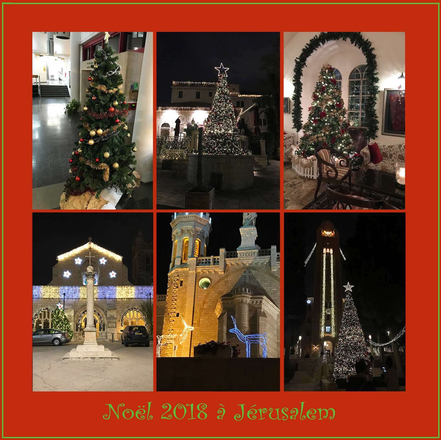 Rangée du haut: Le hall d’entrée de l’Académie Bezalel, un sapin pour les étudiants d’Erasmus et arabes chrétiens. La cour de l’American Colony, lieu incontournable de rencontre et de dialogue et le lobby de l’American Colony.