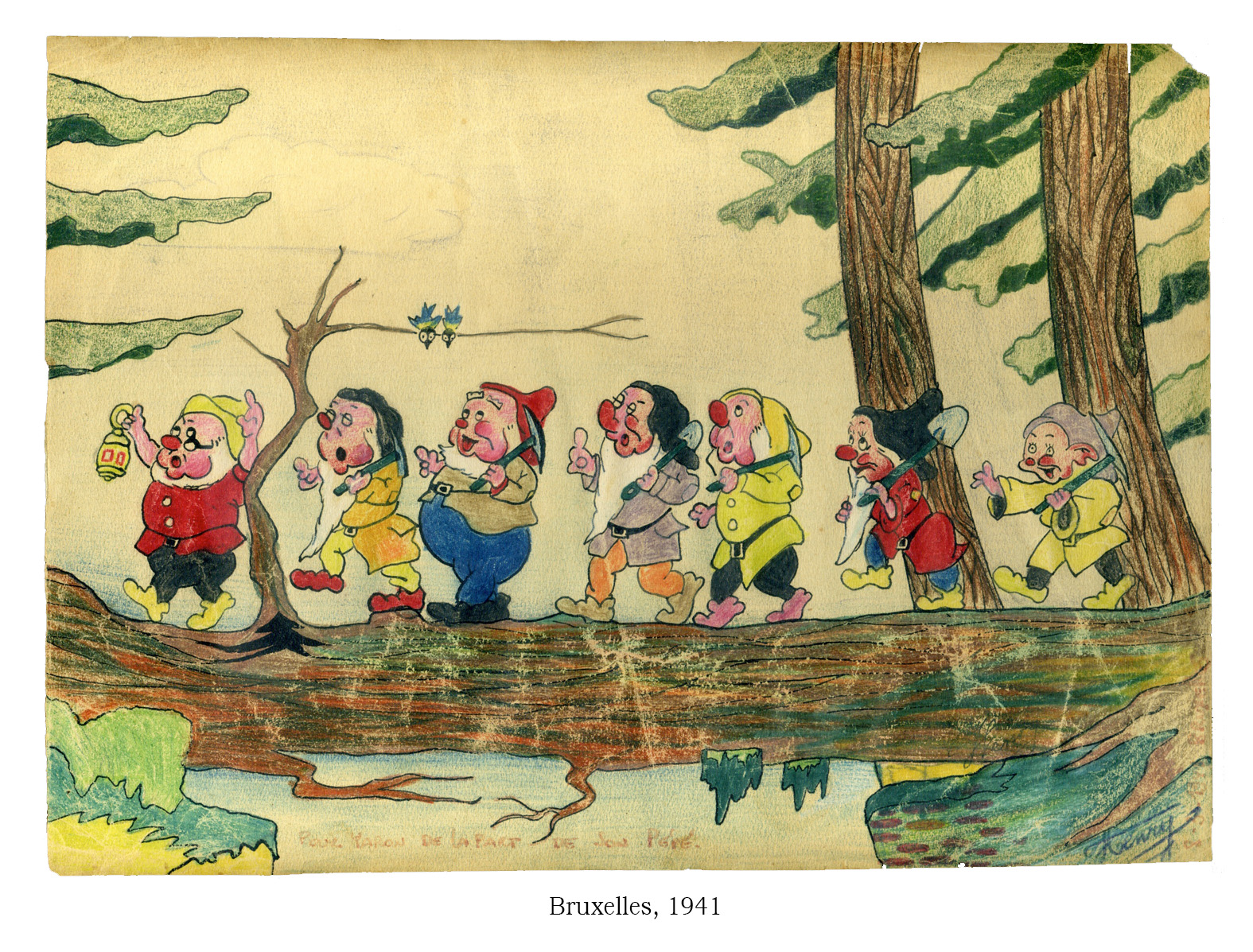 Le film sorti aux Etats-Unis en 1937 fut probablement projeté l’année suivante en Belgique et mon père, jeune adolescent qui rêvait de devenir dessinateur, l’a adoré et recopié. Le dessin réalisé aux crayons de couleurs sur papier est resté pendant des années dans une boîte au fond d’un tiroir. J’ai dû le voir une fois ou deux étant gosse.