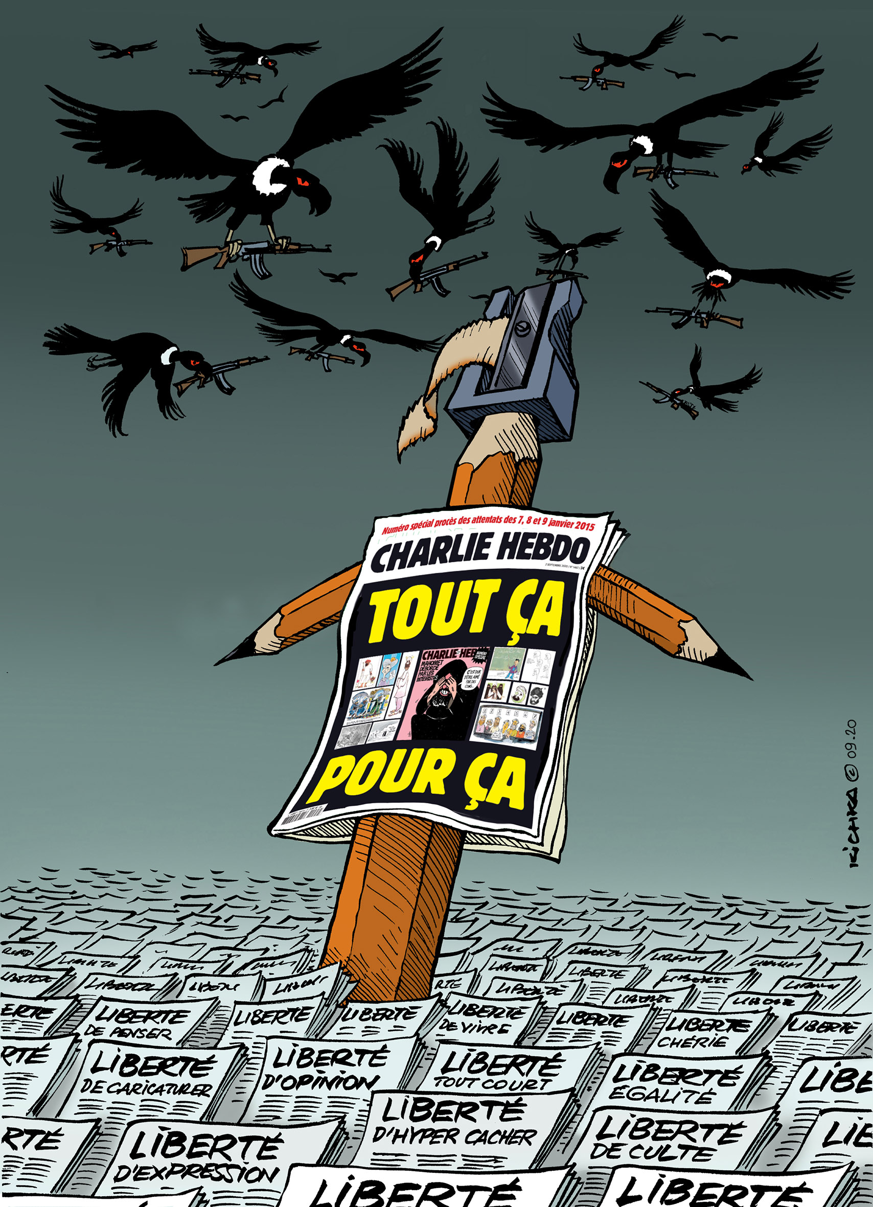 Charlie Hebdo titre juste! Au vu des 12 dessins danois qui ont été à l’origine des massacres des 7, 8 et 9 Janvier 2015. Dix-sept personnes assassinées à Paris, dont cinq caricaturistes, pour douze dessins, très moyens il faut le reconnaître, dessinés et publiés au Danemark le 30 Septembre 2014. Ce n’est qu’en les remontrant, en les remettant à la une de Charlie Hebdo, qu’on peut mesurer l’ampleur des ravages provoqués par une idéologie maladive appelée intégrisme islamiste. Le procès s’étant enfin ouvert, leur republication est tout à fait justifiée, ils sont devenus pièce à conviction.