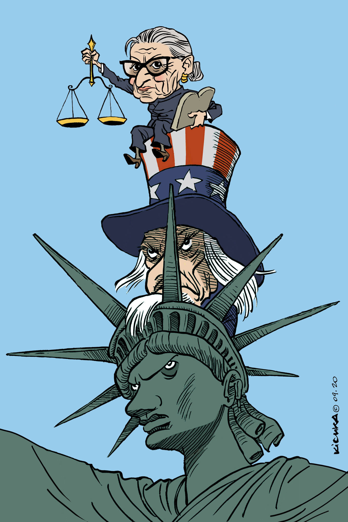 Un dessin en hommage à cette grande dame, une juge démocratique libérale de la Cour Suprême des Etats Unis que Trump est trop content de remplacer par un yes-man ou une yes-woman.