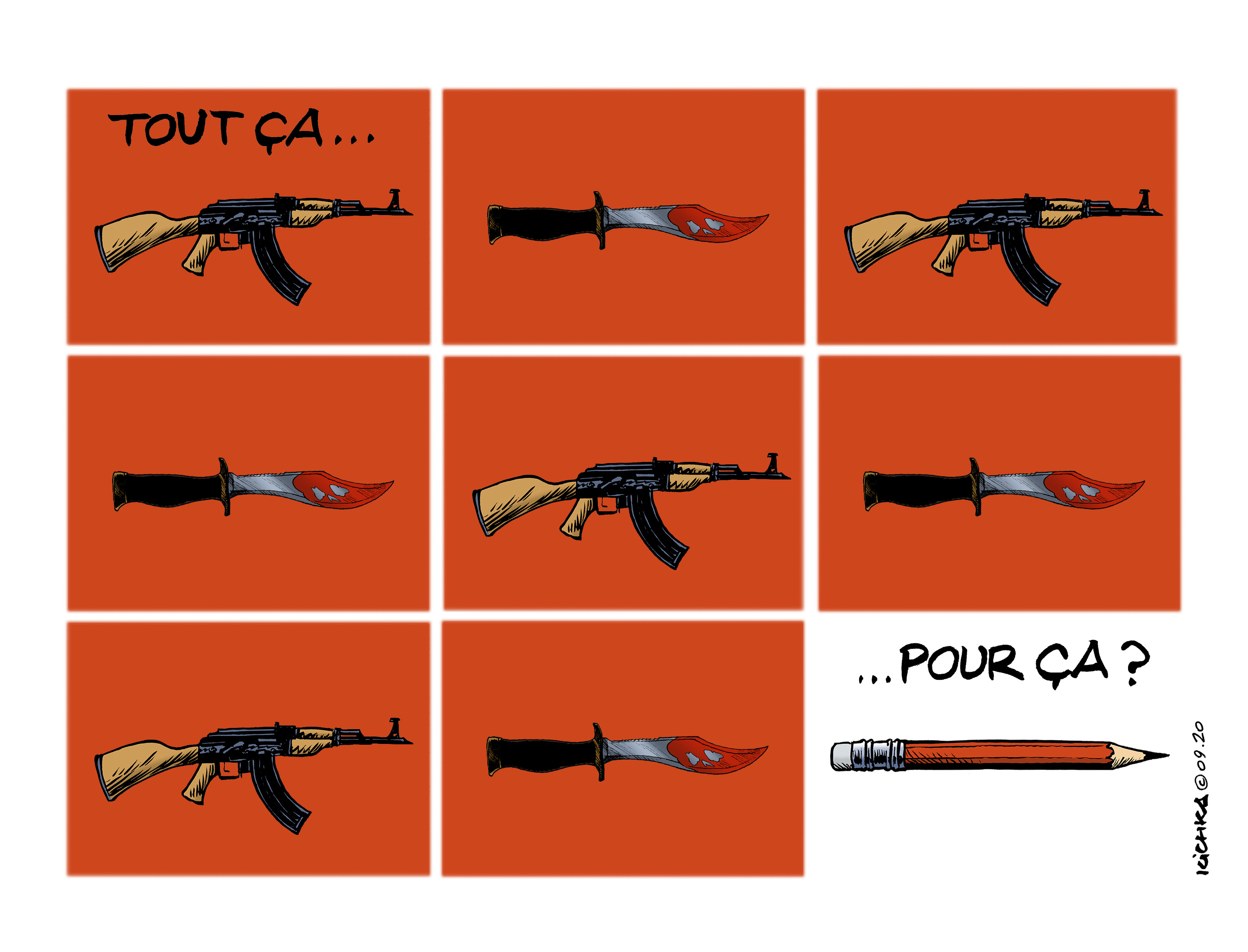 En plein procès « Charlie Hebdo », un attentat à l’arme blanche devant les anciens locaux du journal dans le 11ème. Premier dessin en attendant d’en savoir plus.