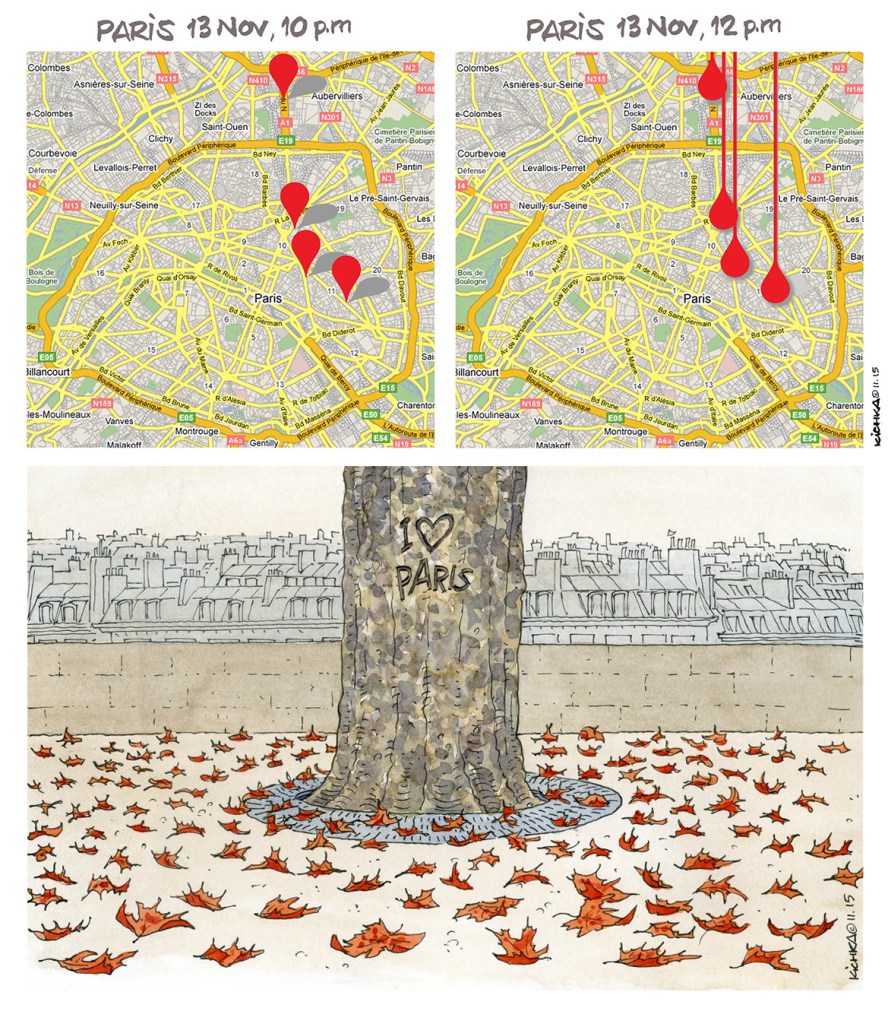 Ce 13 Novembre 2015 la nouvelle des attentats a frappé si vite que j’ai senti que je devais réagir dans l’urgence. Les chaînes d’info montraient le plan de Paris avec l’itinéraire suivi par les terroristes. Ce plan m’a donné l’idée d’un premier dessin alors que les médias n’étaient pas en mesure de donner plus de détails.