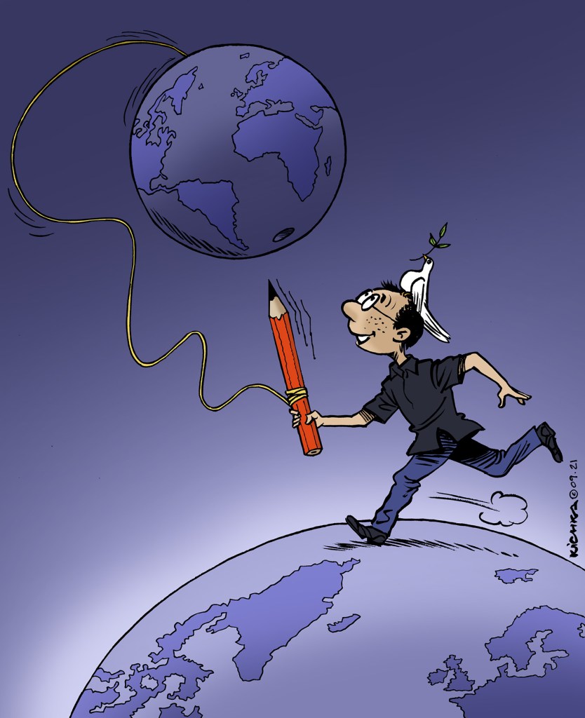 Cela fait 15 ans que Cartooning for Peace fondé par mon ami Plantu, se bat avec des crayons et des couleurs pour la liberté d’expression et d’opinion, la tolérance, la démocratie, la fraternité, le droit de critiquer et de rire, de provoquer intelligemment, de défier les « grands » et les « petits » de ce monde. Cartooning défend les dessinateurs harcelés par leurs régimes partout où la chose est nécessaire. Depuis les attentats de Charlie Hebdo, Cartooning s’est engagée dans des actions pédagogiques ciblées dans des écoles et des prisons dans dix pays.