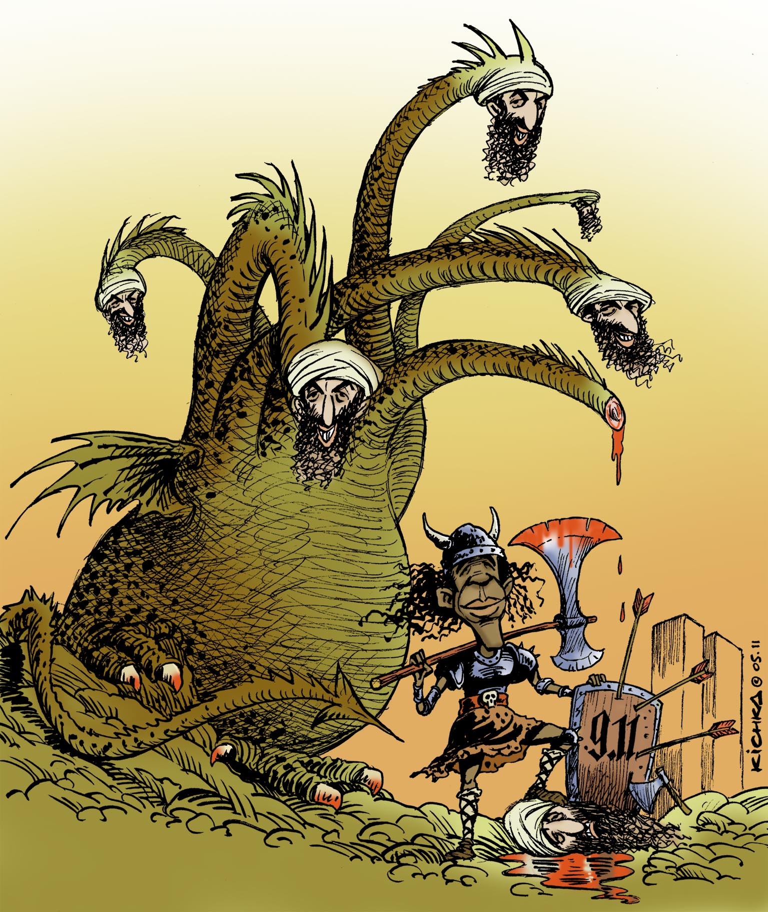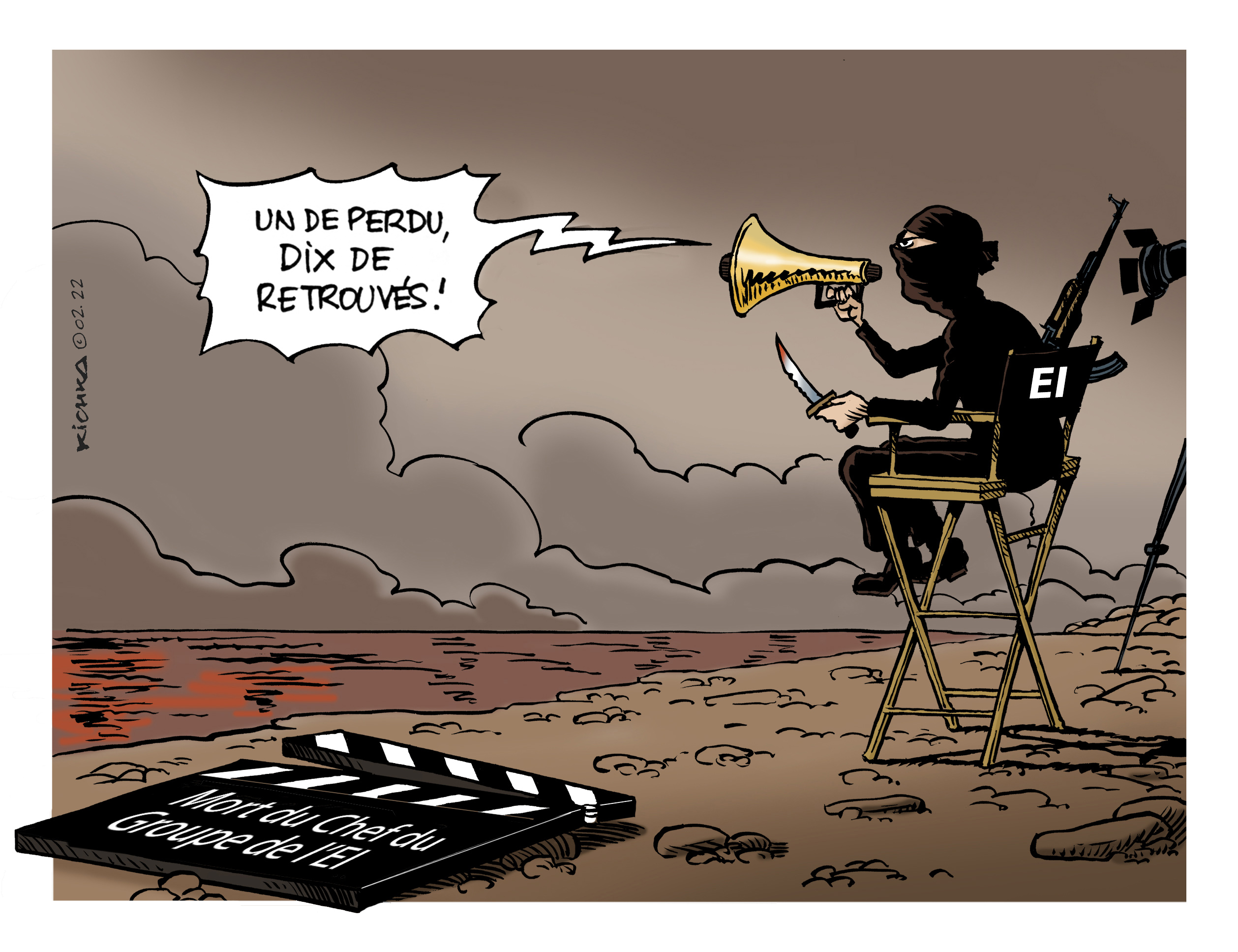 Quand Ben Laden fut liquidé j’ai réalisé ce dessin. Je pourrai faire le mème aujourd’hui en remplaçant Obama par Biden et la tête de Ben Laden par celle d’Abou Ibrahim. Mais j’ai choisi d’en faire un autre.