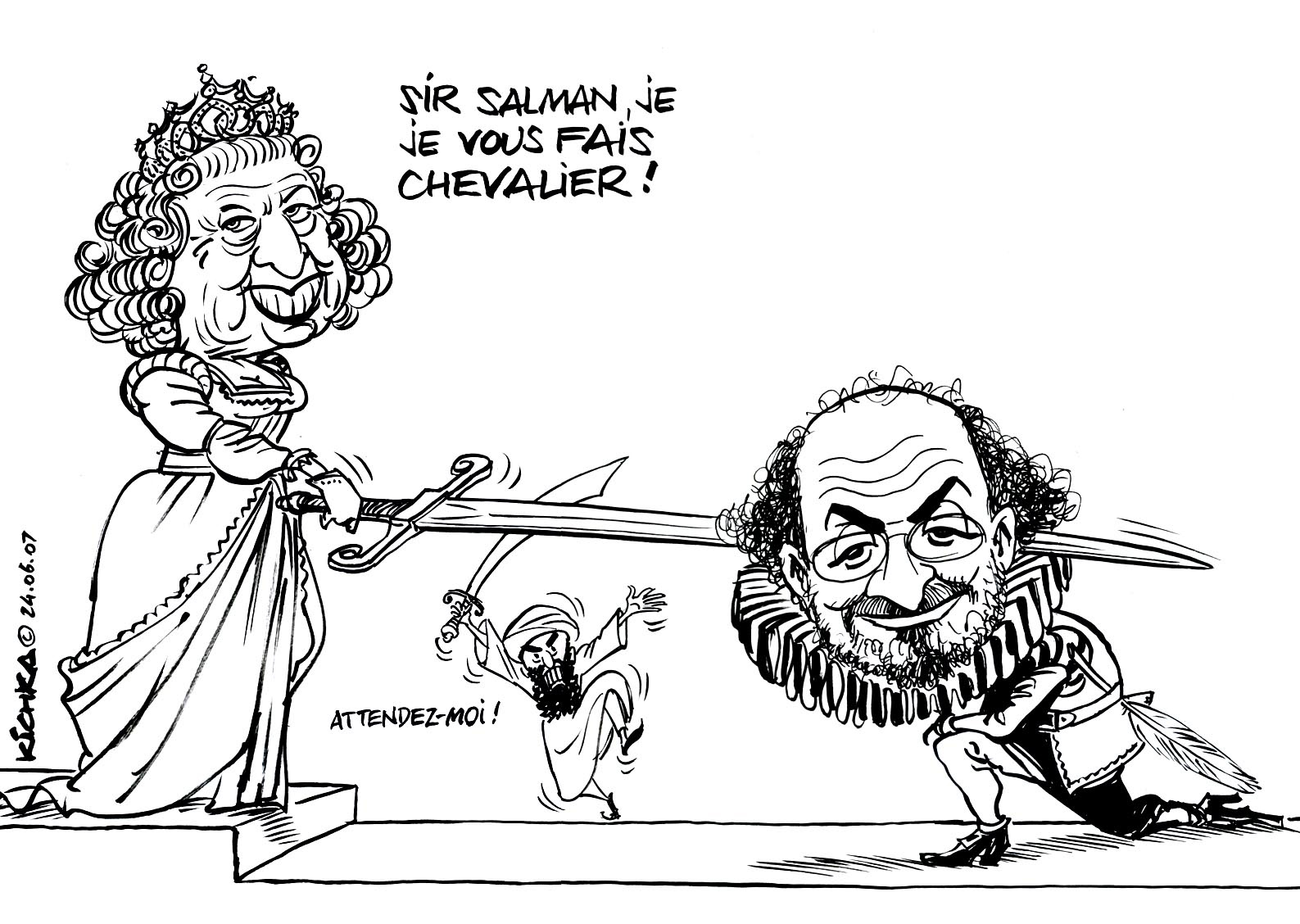 Je remets en ligne ce dessin réalisé en 2007 quand Salman Rushdie avait été élevé au rang de Chevalier par la Reine Elizabeth. À l’époque je me moquais des intégristes qui avaient lancé une fatwa additionnée d’une prime conséquente contre l’écrivain. Un arrête de mort, ni plus ni moins. Je trouvais le dessin rigolo et cet islamiste qui courait sabre à la main, ridicule. Le dessin est, il faut le reconnaître, moins marrant à la lumière des événements de cette journée. Les intégristes n’en sont pas moins ridicules. Ils ne nous convertiront pas ni ne nous intimideront par le sabre.
