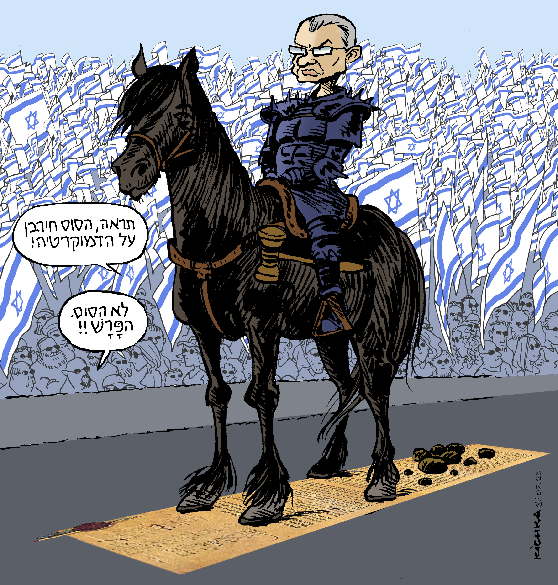Explication de mon dessin: le ministre de la Justice, Levine, en policier monté piétinant la charte de l’indépendance d’Israel. Un des manifestants: « Le cheval a chié sur notre démocratie! ». Un autre lui répond: « Pas le cheval, le cavalier! »