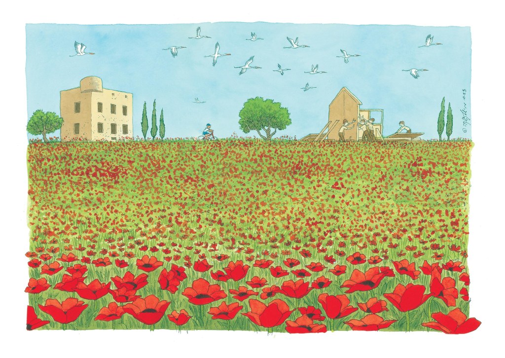 Une des particularités du kibbutz est qu’en Janvier ses champs se couvrent de tapis infinis de coquelicots rouges que des dizaines de milliers d’israéliens viennent photographier en famille. C’est cette image que j’ai voulu fixer dans mon illustration car elle représente pour moi le kibboutz d’avant le Chabbat Noir du 7 Octobre.