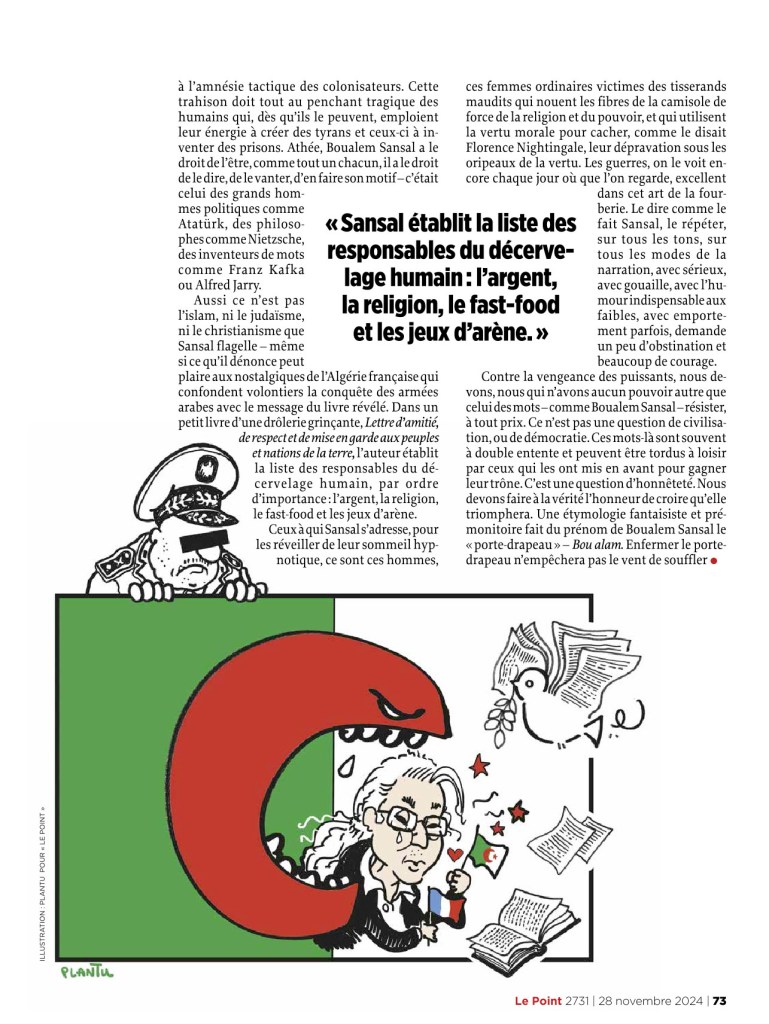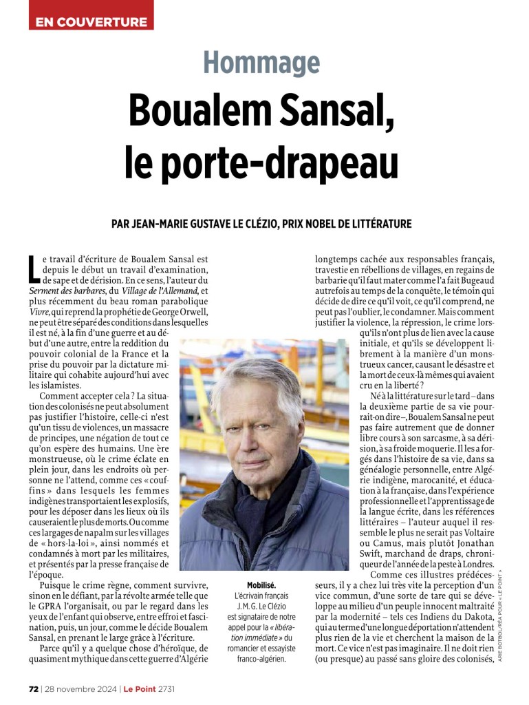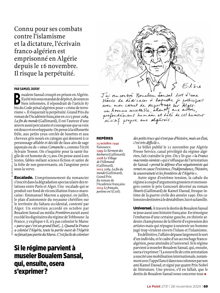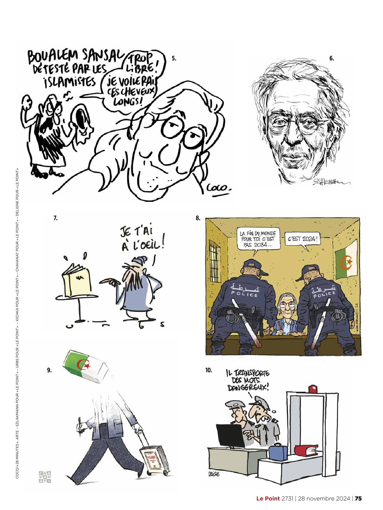Le Point consacre un dossier spécial à Boualem Sansal dans son combat pour sa libération. L’arrestation et la séquestration de Sansal est le point culminant d’une véritable affaire d’état entre l’Algérie et la France. Sansal en paye malheureusement les frais. Une affaire à suivre. Merci à Xavier Gorce qui a demandé des dessins de soutien.