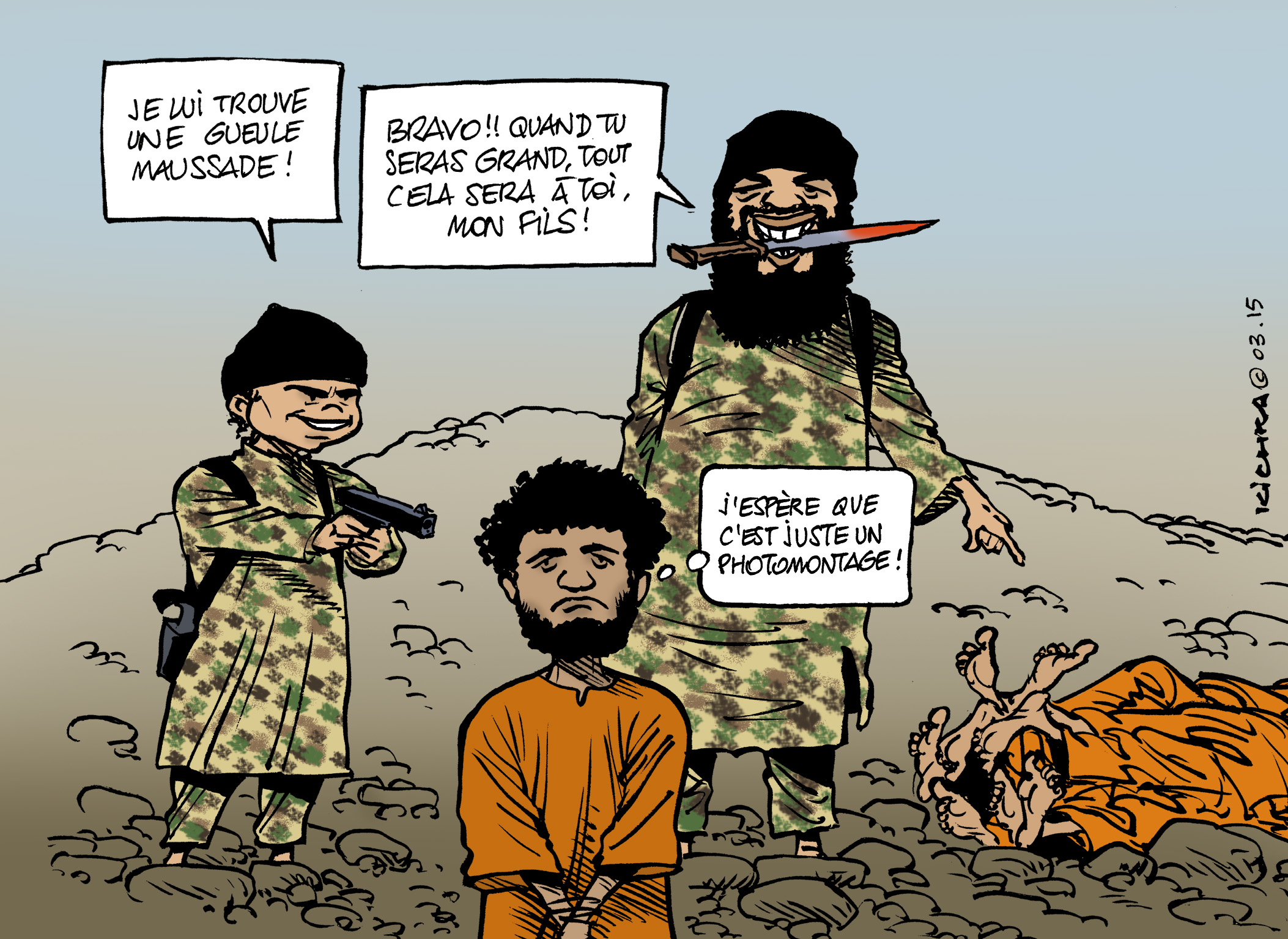 Comment marquer cet événement est une question délicate que je me suis posée. J’ai finalement opté pour une forme de « légèreté » apparente, par la réflexion faussement naïve émanant de la bouche d’un enfant. Les enfants, pas plus, ni moins que les adultes, ne peuvent comprendre la « logique » de la barbarie.