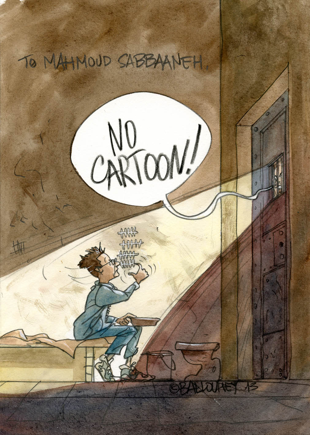 Un dessin de soutien pour le dessinateur palestinien Mahmoud Saba’aneh emprisonné en Israel. Sans le connaître et sans connaître les raisons de son emprisonnement, je pense que la place de ce jeune dessinateur n’est pas au « Salon des Refusés ». Je défends sa liberté d’expression et condamne la liberté d’oppression dont Israel use parfois sans juste mesure.