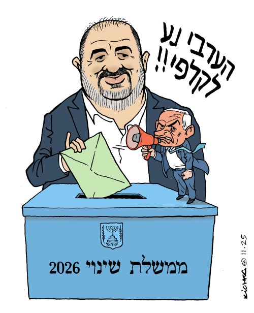 Bibi comprend bien que l’électorat arabe serait aux prochaines élections un « Game Changer » qui lui ferait perdre le pouvoir. Rester en place est son seul programme. Mantsour Abbas (sur le dessin) et son parti Ra’am, ont fait partie de la grande coalition du gouvernement Bennet-Lapid qui fut un bon gouvernement mais qui tomba après un an et demi. L’incitation à la haine des arabes israéliens faussement accusés d’être des alliés du Hamas fait partie de la stratégie de la droite religieuse nationaliste.