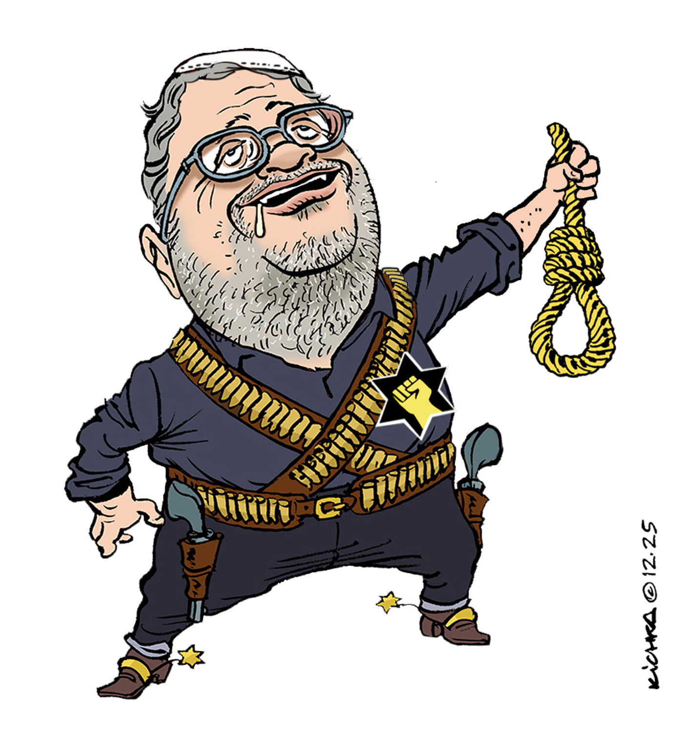Ben Gvir, le ministre raciste de la droite messianique extrémiste, fait la promotion de la peine de mort pour les terroristes (arabes seulement!) à l’aide du pins « corde de pendu » qu’il a fait faire et qu’il arbore sur son veston au parlement. Rappel: Ben Gvir est l’allié de Bibi dont il a facilité la réélection il y a trois ans.