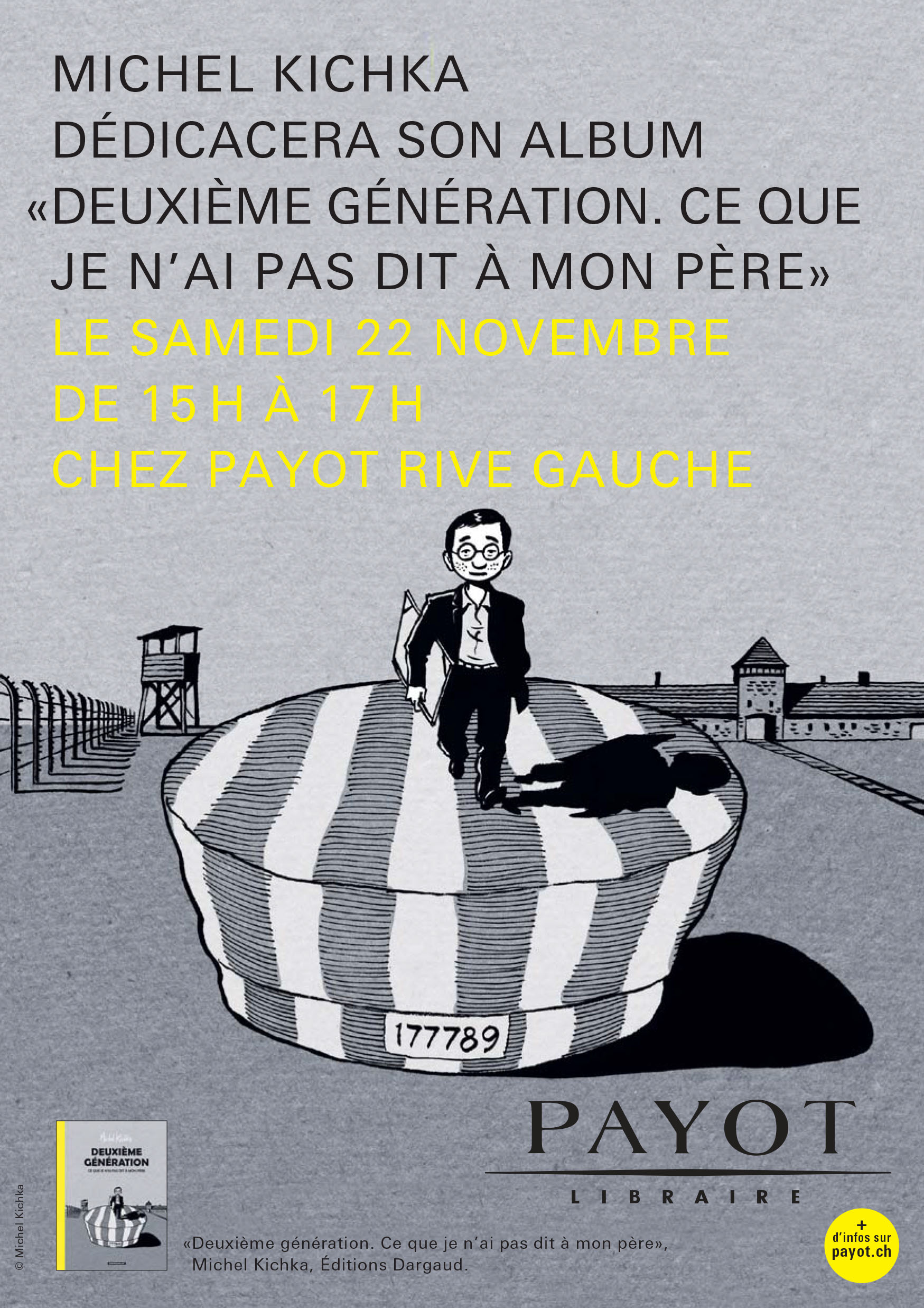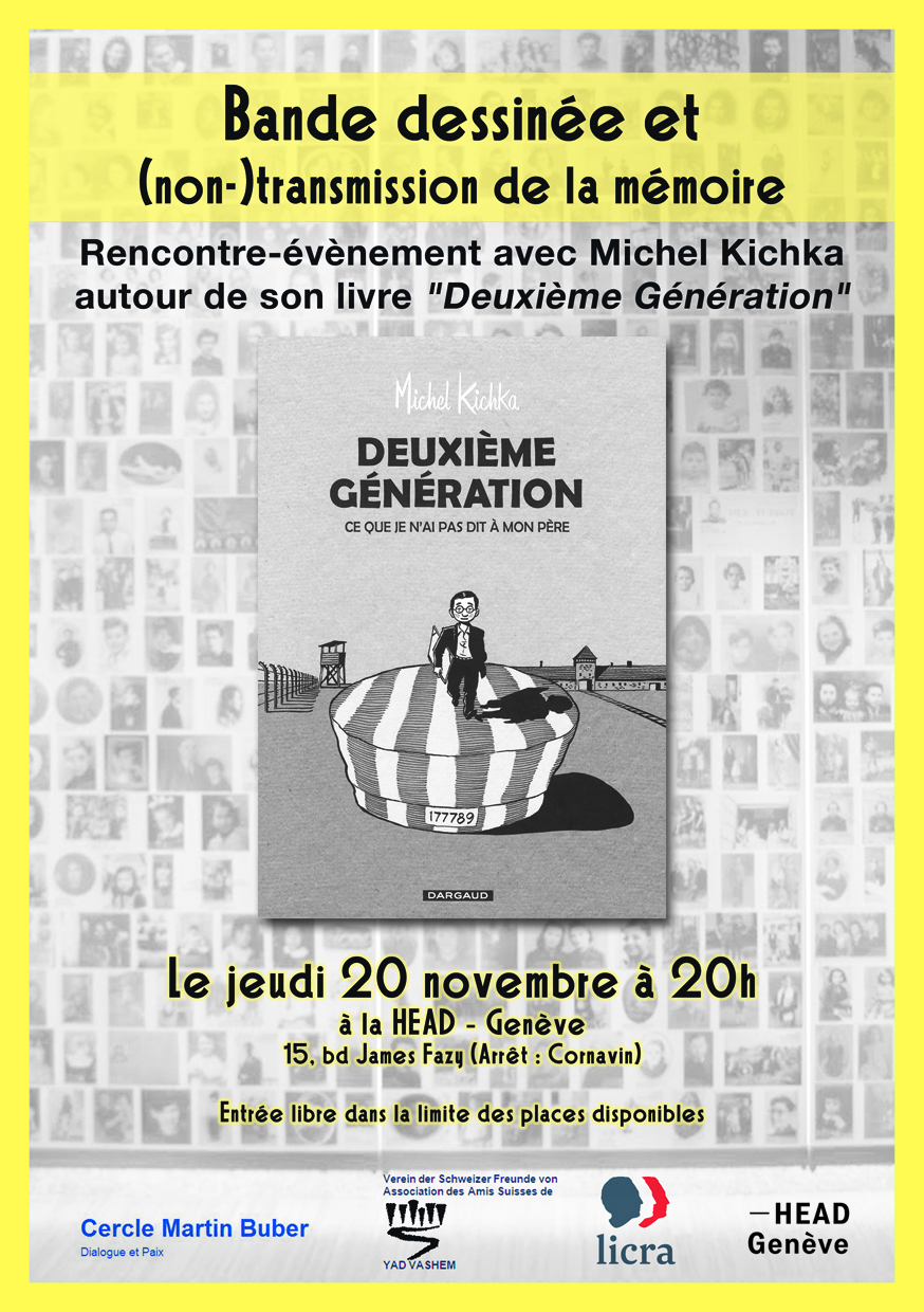 « Deuxième Génération » n’a pas encore été présenté au public suisse francophone. Le wekend prochain, à l’invitation du Cercle Martin Buber, ce sera chose faite. Une rencontre-dédicace en présence de mon éditrice chez Dargaud, Gisèle de Haan, se tiendra le 20 Novembre à la Haute Ecole d’Art et de Design de Genève. Une signature aura lieu le 22 à la librairie Payot Rive Gauche.