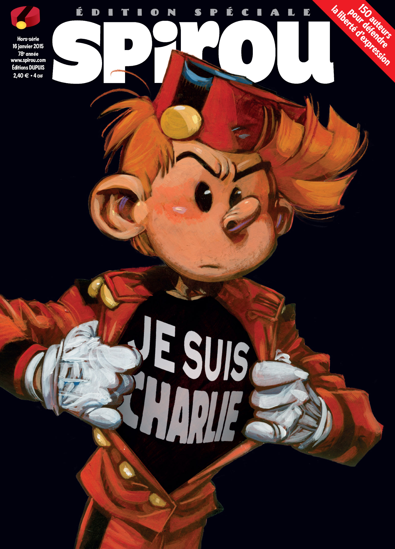 Même ce magazine BD de mon enfance où je lisais chaque semaine les aventures de Spirou et Fantasio, de Gaston Lagaffe, de Lucky Luke, de Johan et Pirlouis et des Schtroumpfs, de Boule et Bill, de Gil Jourdan, de l’Oncle Paul, de Benoît Brisefer, etc, se mobilise pour soutenir Charlie Hebdo. Un bel exemple de démocratie donné aux jeunes lecteurs. Je suis fier d’y avoir contribué.