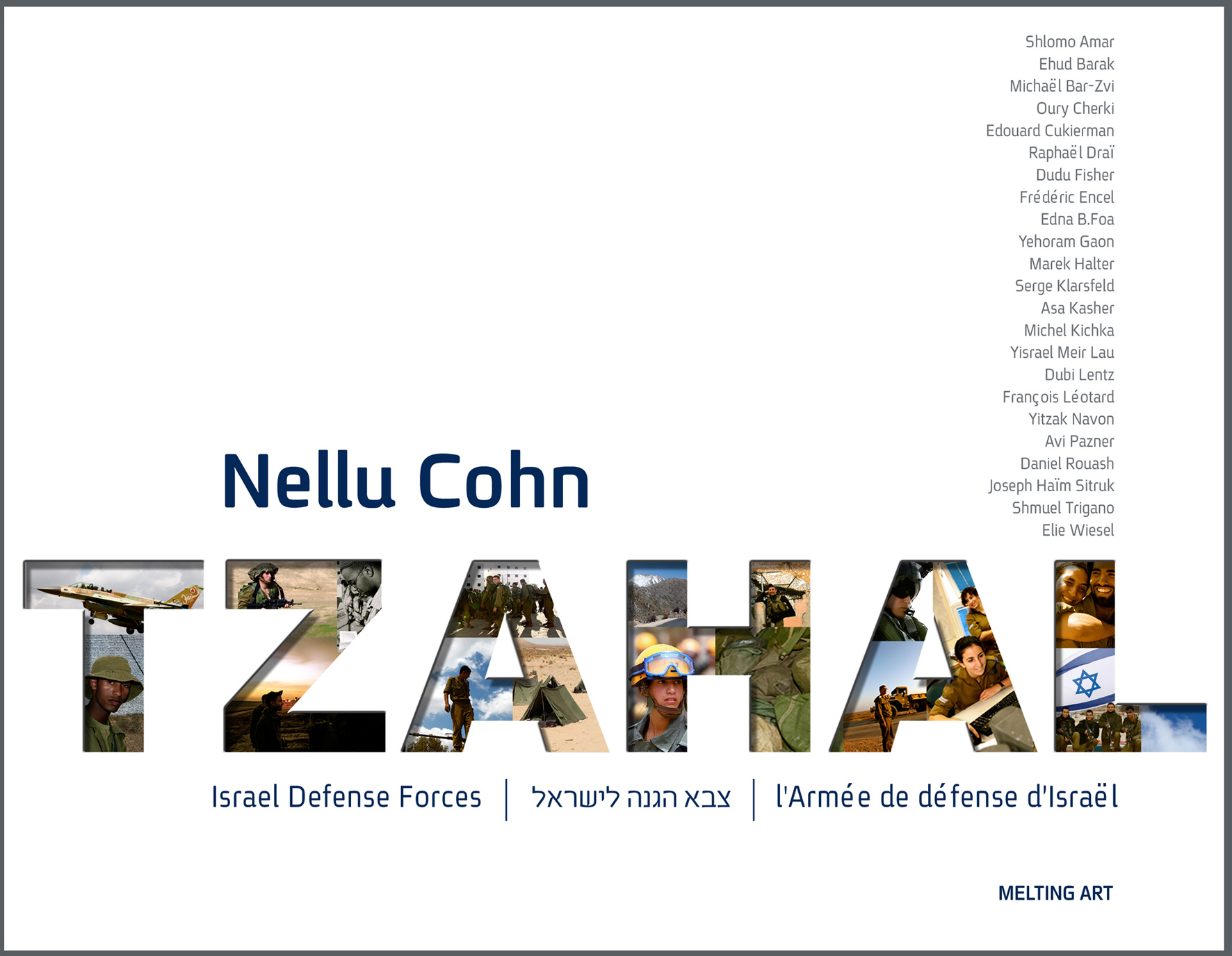 Nellu Cohn a réalisé ce très beau livre, riche en images et en textes, sur Tzahal. L’ ouvragetente de ré-humaniser l’armée israélienne tant démonisée ces dernières années. Nellu a eu accès à des bases de Tzahal, à des entrainements et à des moments de détente que l’on n’a pas l’habitude de voir. Ses photos surprennent par leur simplicité et leur spontanéité, et vont à l’encontre d’une héroïsation patriotique bêbête à laquelle on aurait pu s’attendre. Son livre précédent paru aux éditions Melting Art, était consacré à Tel Aviv.