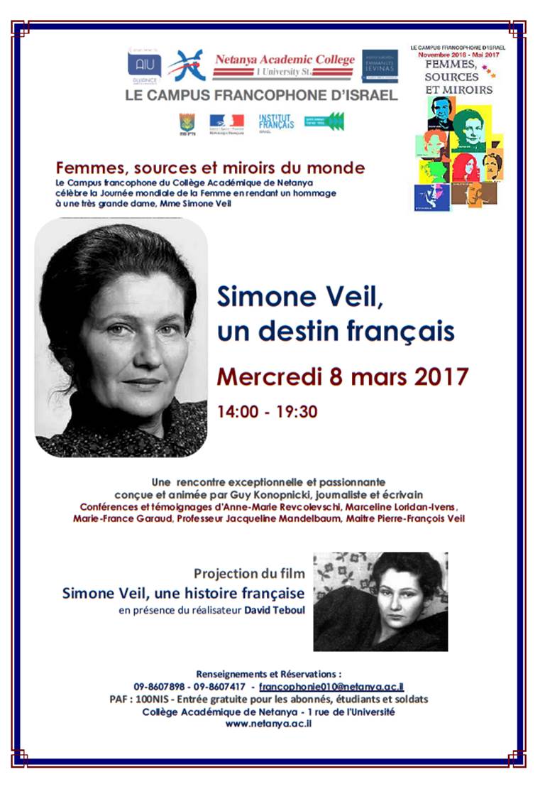 Le Collège Académique de Netanya, où se tient le campus francophone d’Israel, célèbre le Journée Internationale de la Femme en organisant une journée consacrée à Simone Veil ce mercredi 8 Mars.
