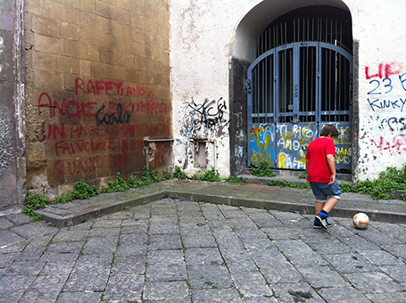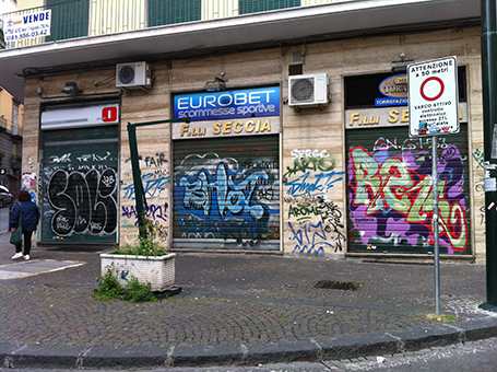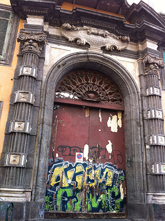 Ces graffitis rampent et s’accrochent comme les lichens des forêts ou les taches de moisissure du gorgonzola, voire encore comme des taches d’humidité dans les caves. Ils font partie du paysage urbain. Finalement, à force, ils camouflent les murs qui s’effritent et rajeunissent les monuments du passé. Beaucoup de grandes villes au monde sont tatouées d’inscriptions et de dessins. Mais ici à Naples, elles sont un peu un clin d’oeil post moderniste fait au merveilleuses fresques murales de Pompéi, qui elles me rappellent les fresques évanescentes de Roma Fellini.