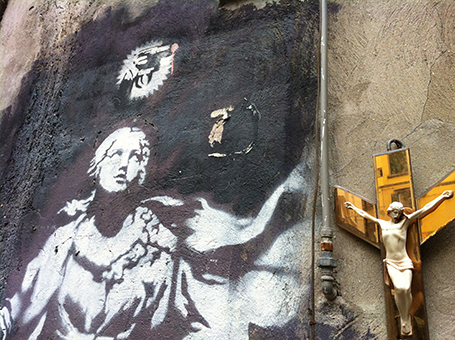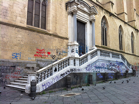 Naples n’a pas que la pizza comme spécialité. Elle n’a pas que la coupe italienne de foot. Elle a le graffiti. Et oui, il y en a partout! Sur les murs, les volets, les portes cochères, les panneaux de signalisation, les monuments et les murs extérieurs des églises dont les murs intérieurs restent vierges. Jusqu’à nouvel ordre! Dans les ruelles étroites et aussi sales que charmantes du vieux Naples, les tags ajoutent une note de couleur au gris dominant. Jamais vulgaires, jamais violents.