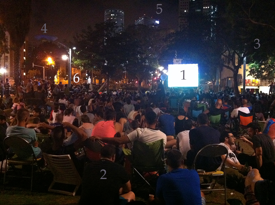 1- Le grand écran sur l’herbe fraîche de Sarona, ce nouveau quartier cool de Tel Aviv, diffuse les images de la finale de la Coupe du Monde qui oppose l’Allemagne à l’Argentine