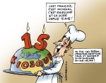 L’émission emblématique de TV5 Monde, Kiosque, a fêté ses 15 ans par une émission spéciale et particulièrement festive d’une heure et demie, tournée sur trois plateaux différents et menée de main de maître par Philippe Dessaint, connu des auditeurs francophones du monde entier. Une centaine de correspondants étrangers, invités habituels de l’émission, étaient de la partie, ainsi que cinq dessinateurs: Ali Dilem le cartooniste de la maison, Plantu, Kroll, Ana von Rebeur et moi-même. J’ai réalisé ces deux dessins, le premier pour la fête et le second pour les remercier. Les deux « vendeuses » dans le kiosque à journaux sont Marie-Christine Saragosse directrice des programmes et Sylvie Braibant rédactrice et écrivain du blog Caravane sur le site TV5.org. Celui qui lit le Kiosque en hébreu est Philippe Dessaint.