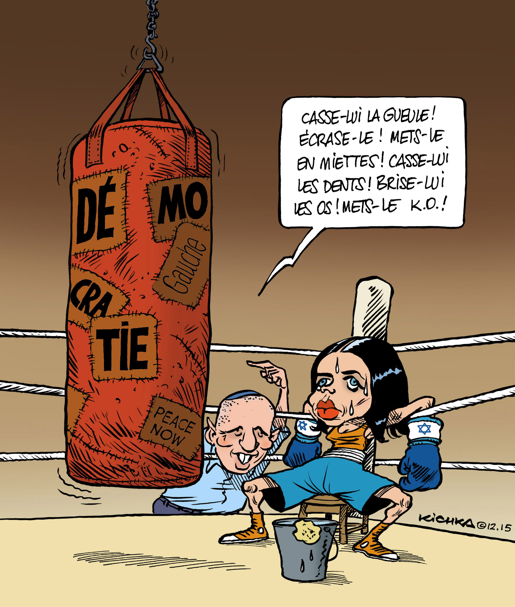 Naftali Bennet, Ministre de l’Education et Ayelet Shaked, Ministre de la Justice, lui à la tête du parti de la Droite Nationaliste « Le Foyer Juif » et elle son numéro 2, sont en campagne ouverte contre la Gauche israélienne. Ils tentent sans répit de délégitimer les ONG financées en partie par l’Europe, veulent limiter les pouvoirs de la Cour Suprême, réécrivent des manuels scolaires selon leur agenda politique. Ils sont une menace constante pour la démocratie et ont fait le lit de l’extrême droite qu’ils ne condamnent généralement que du bout des lèvres. Cette droite qui est au pouvoir dans une coalition droite-droite majoritaire, joue les vierges effarouchées quand la gauche très minoritaire la charge frontalement et verbalement. En Israel, la violence physique n’est jamais venue de gauche!