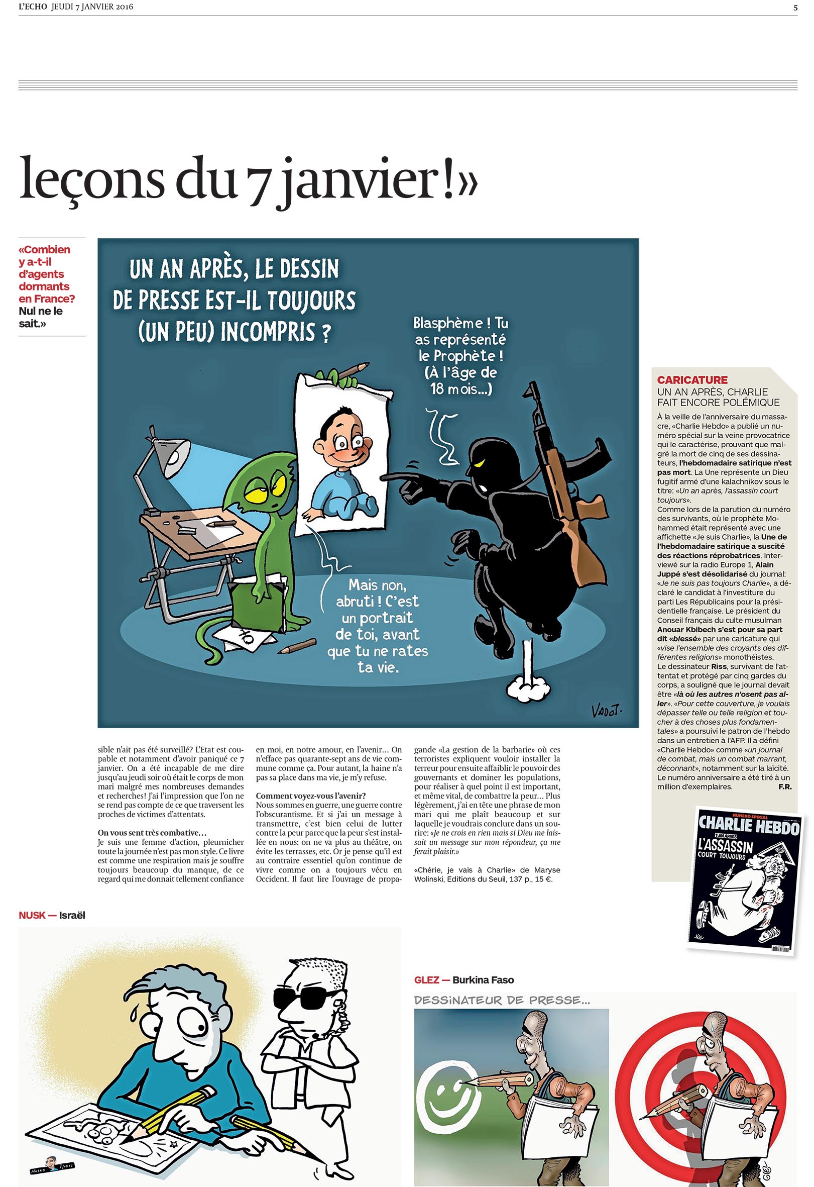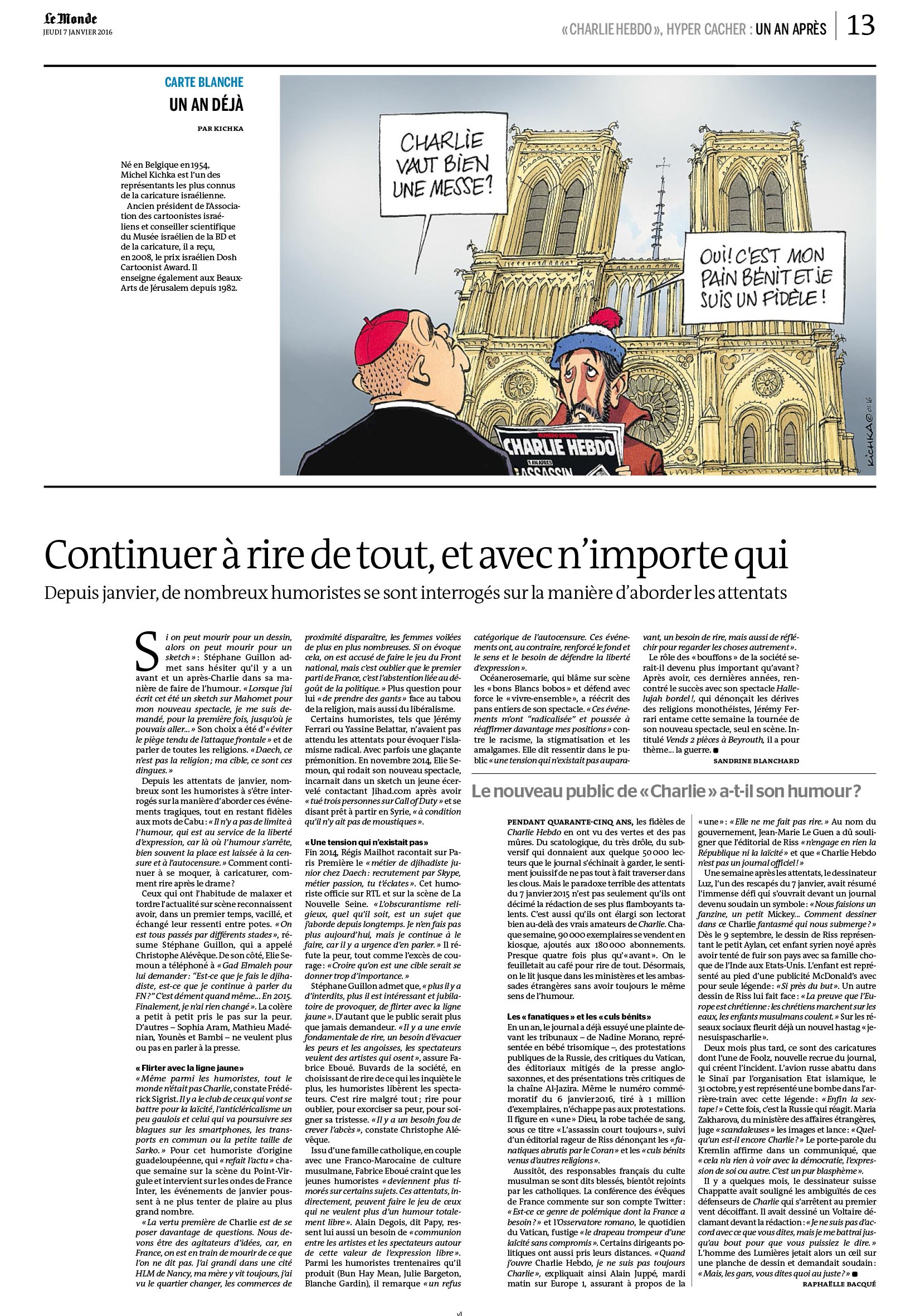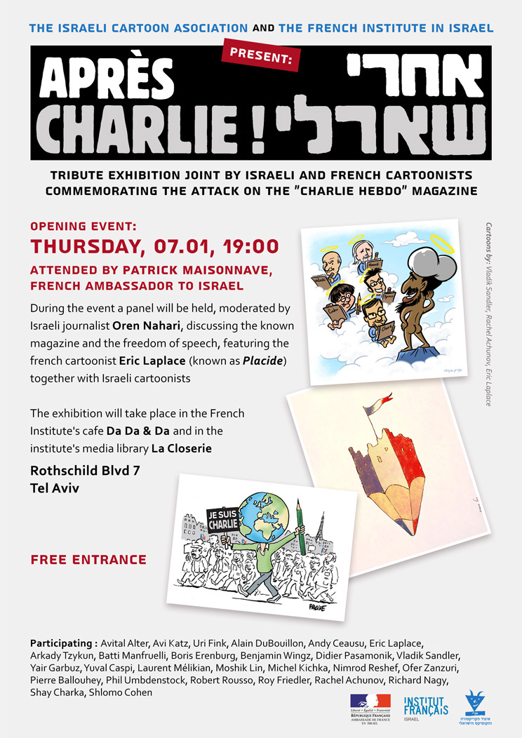 Ce jeudi 7 janvier une exposition suivie d’un débat se tiendra à l’Institut Français de Tel Aviv, sous le nom « Après Charlie », un an après les attentats de Charlie Hebdo. Une année est déjà passée mais les tueries du journal satirique et de l’Hyper Cacher retentissent encore et ont été suivies par les massacres du 13 Novembre de la Génération Bataclan. Vendredi dernier la tuerie dans des pubs tel aviviens est venue relier entre eux toutes .