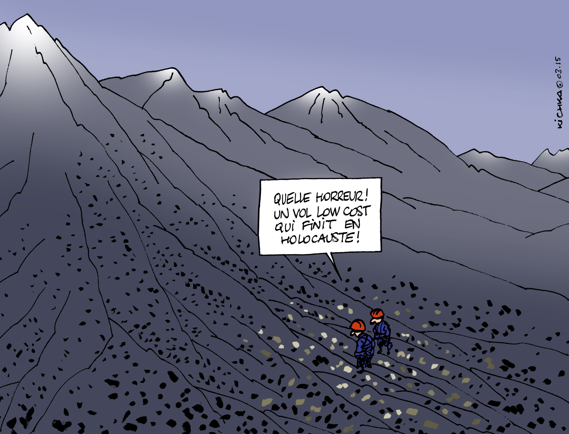 Quelques fidèles de mon blog ont été quelque peu dérangés par l’utilisation du mot « holocauste » dans le texte du dessin ci-contre, car émanant de moi, il leur semblait que le terme faisait nécessairement allusion à la Shoah. Je l’ai utilisé à son sens premier, c’est-à-dire « sacrifice », tout en étant conscient que la confusion pouvait troubler les esprits. La catastrophe de l’Airbus qui a d’abord été perçue comme catastrophe pour les victimes et leurs familles, s’est avérée être non pas un accident mais une acte voulu par le copilote. J’estimais qu’il fallait que je réagisse par quelque chose de plus fort que d’habitude.