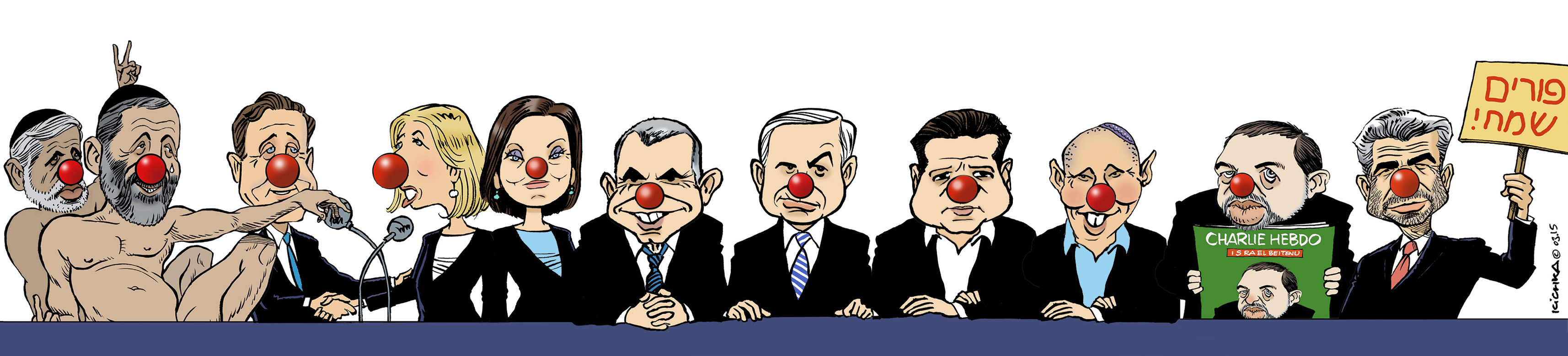 Merci aux surfeurs qui m’ont fait remarquer que j’avais oublié d’inclure Naftali Bennet dans le dessin de Pourim.