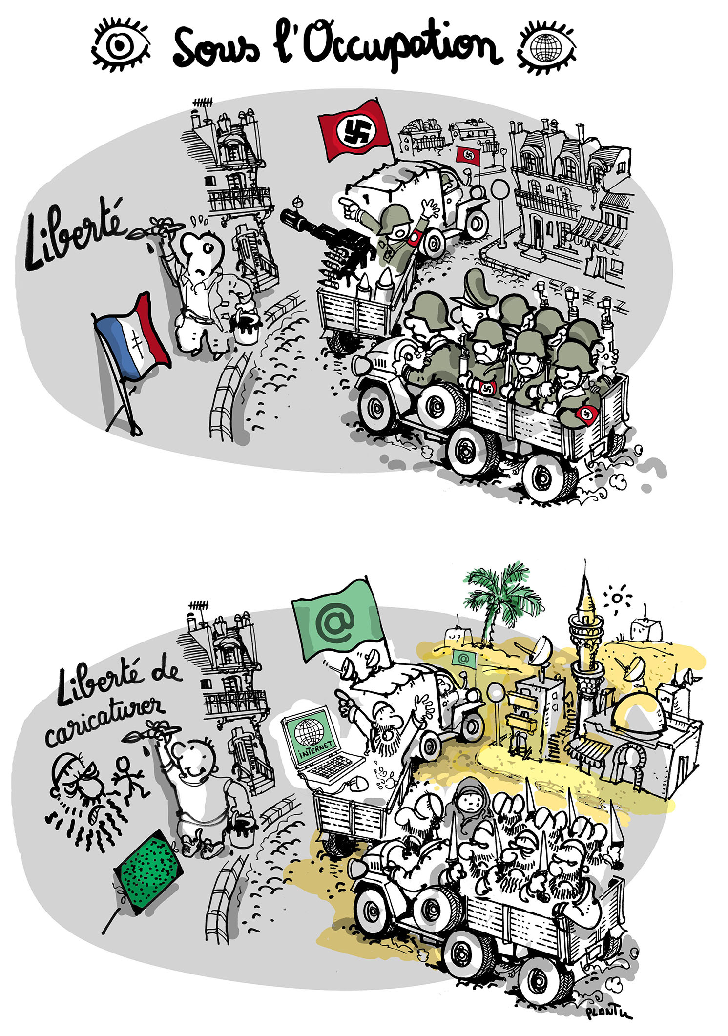 Extrait d’une interview par Roni Bar, Haaretz. Plantu: “I view the Internet as a kind of occupation. There are other Nazis that watch us all the time, and because of them we cannot draw what we want.” Dessin publié il y a deux dans l’Express et qui illustre parfaitement son propos.