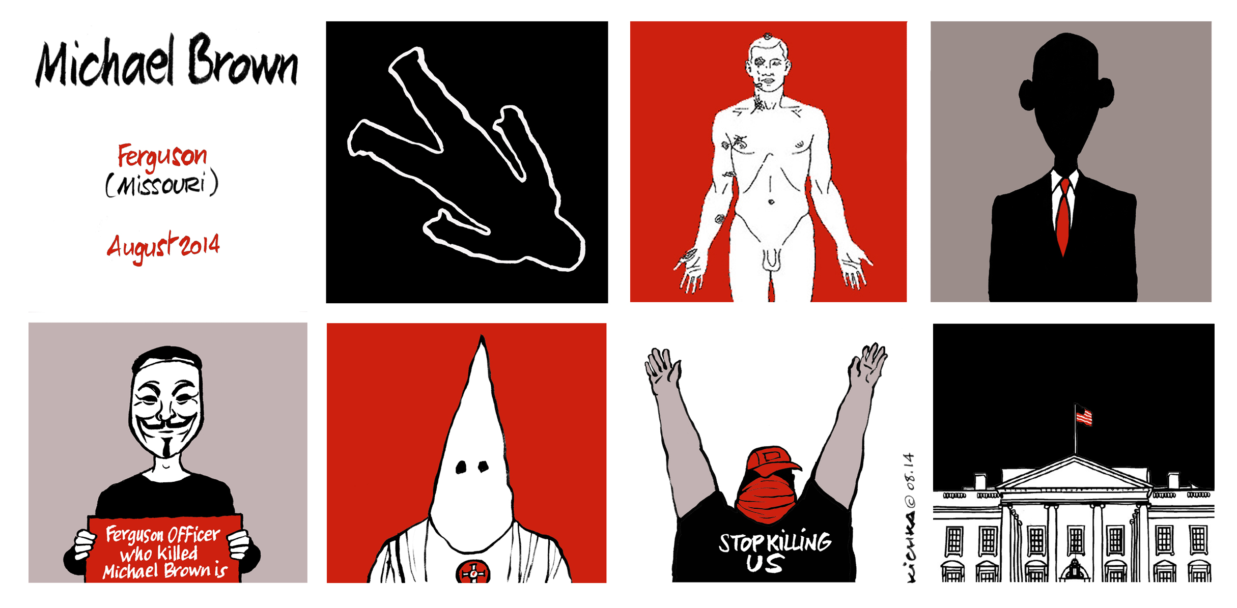 Escalade de la tension depuis 12 jours dans le Missouri suite à la mort de Michael Brown, un adolescent noir américain du 18 ans. Des manifestations violentes, avec blessés et un mort de plus, et qui rappellent les émeutes noires de années 60 aux USA. Le fond est socio-économique, comme toujours. La police ne maîtrise pas la situation, le KKK prend la défense de l’officier de police qui a criblé Michael Brown de 6 balles dont 2 dans la tête, alors que Anonymus diffuse son nom sur les réseaux sociaux, etc….