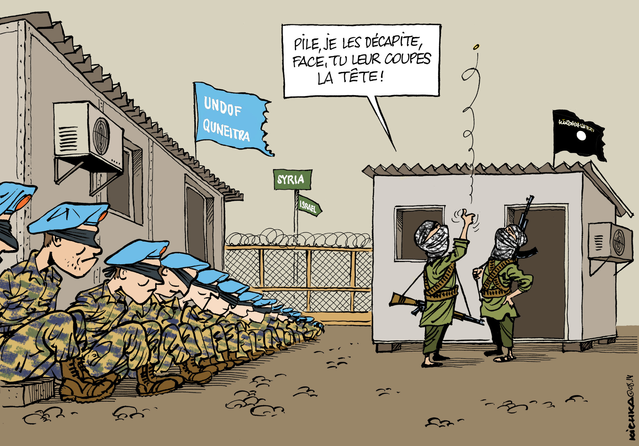 Quarante trois Casques Bleus de l’UNDFO aux mains d’Al-Nosra, une branche armée d’Al Qaeda. L’islamisme fondamentaliste violent en position de force en Syrie et aux portes d’Israel. Conflit régional et conflit mondial se rejoignent à un point géo-politique hyper-sensible. L’ironie est qu’ils sont un ennemi commun des USA, de la France, d’Israel et la Syrie.