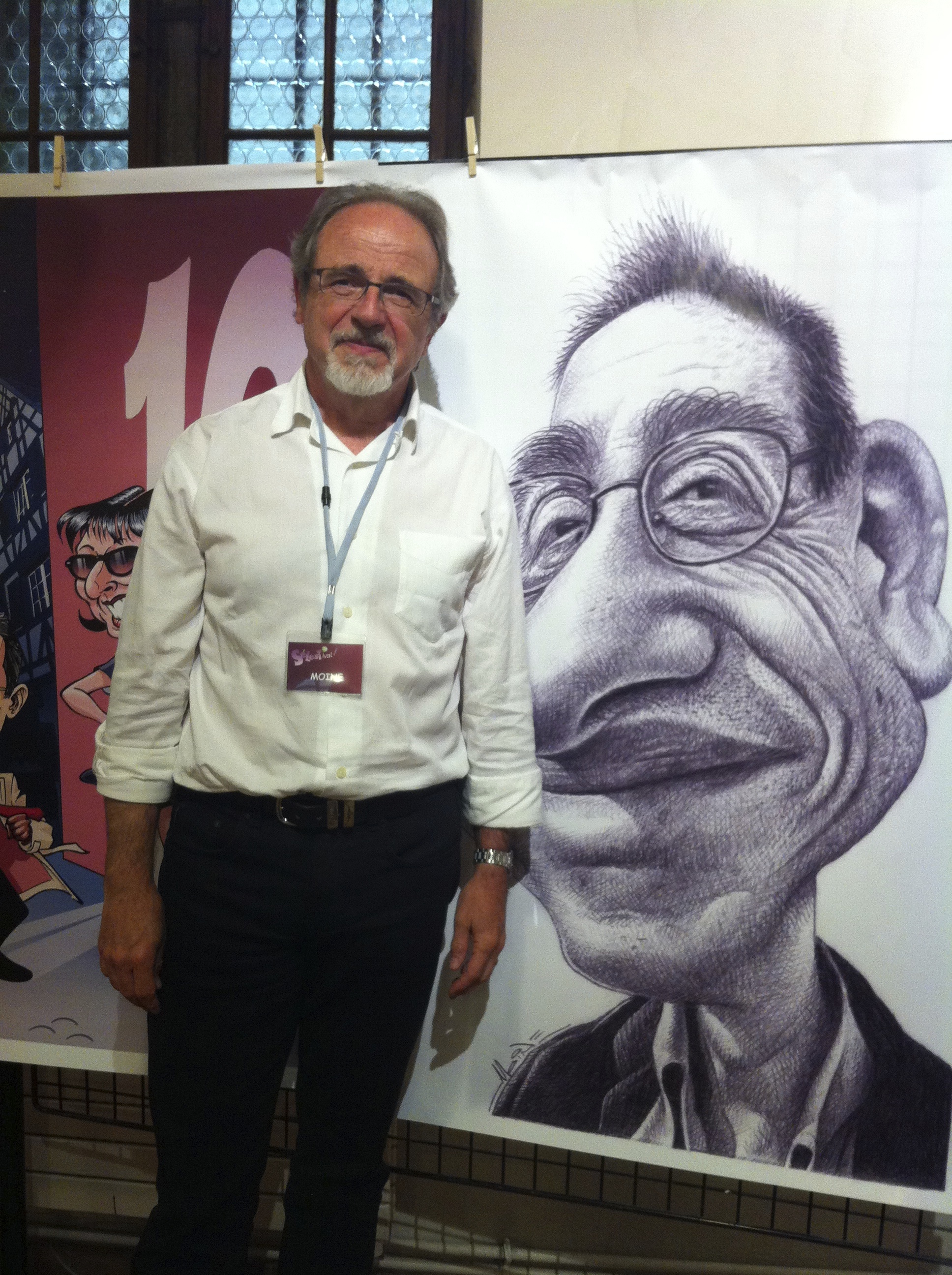 Invité par le Festival de Sélestat près de Strasbourg, je me suis vu offrir ma « grande gueule » réalisée par le très talentueux Moine. Je me reconnais totalement dans cette caricature où Moine a fait tous les bons choix afin de se lancer dans une analyse de ce qui me caractérise le plus. On y retrouve l’architecte qui est en lui, avec sa compréhension des structures et des forces qui agissent. La façade est très réussie, mais c’est la vie intérieure qu’il est si bien parvenu à capter. Un petit chef-d’oeuvre et une grande joie!