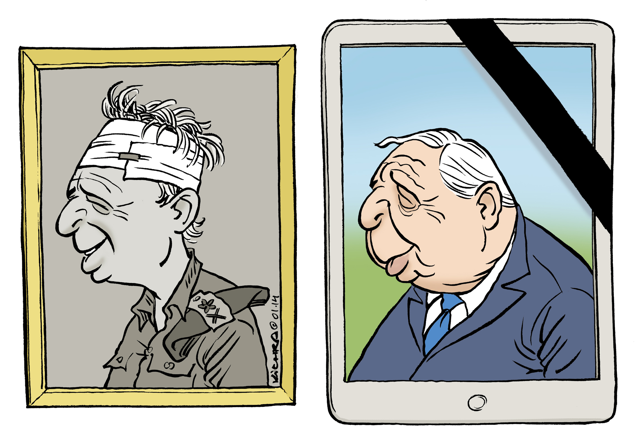 Un dernier dessin de Sharon. Héros de trop de guerres, responsable de la première Guerre du Liban, grand constructeur des implantations, mais aussi démanteleur des colonies de la Bande de Gaza, opposant farouche de Bibi au sein du Likoud qu’il quittera pour fonder Kadima.