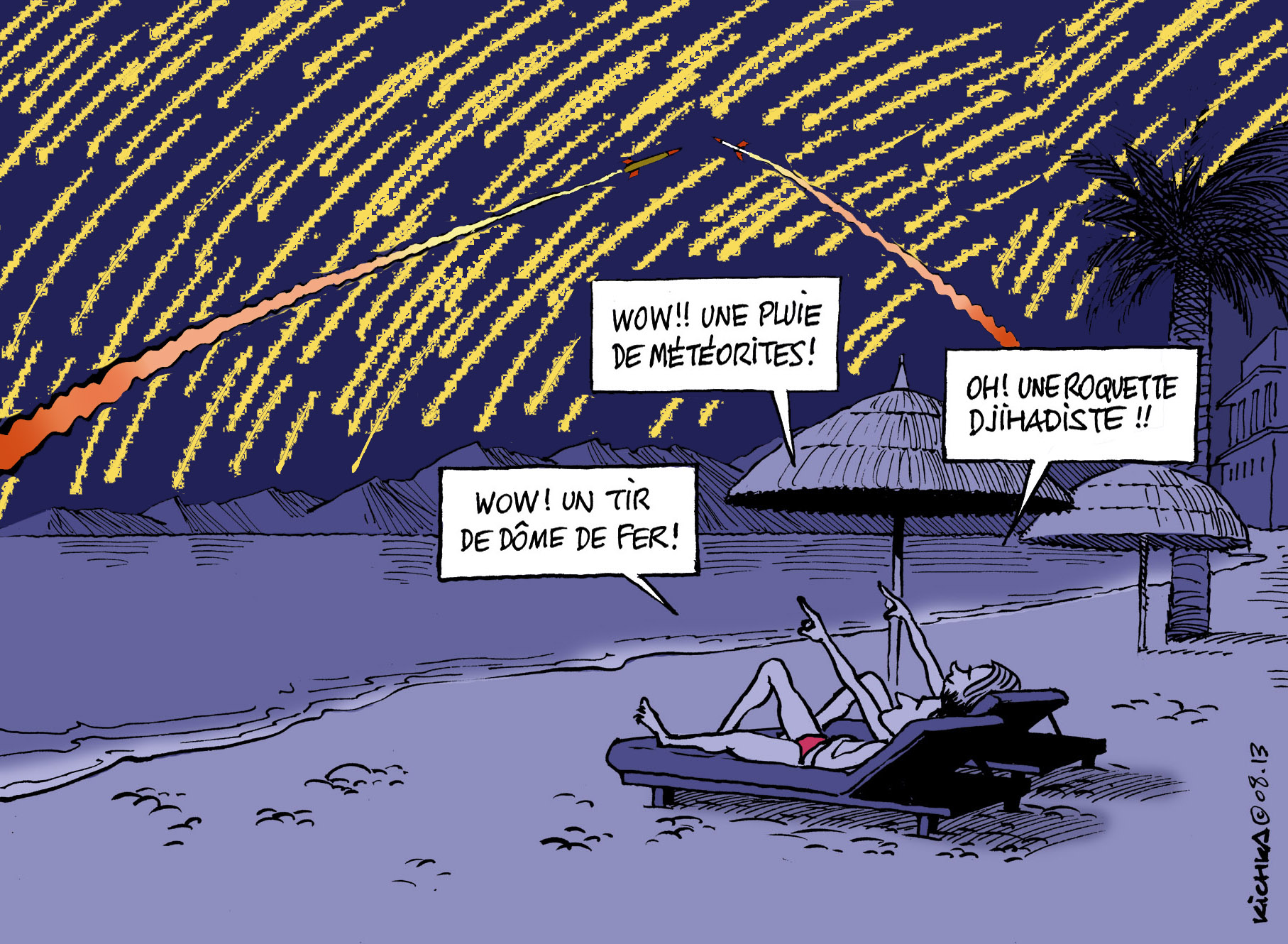 A Eilat, cité balnéaire du Sud d’Israel, deux OVNI se sont mêlés au spectacle: une roquette djihadiste