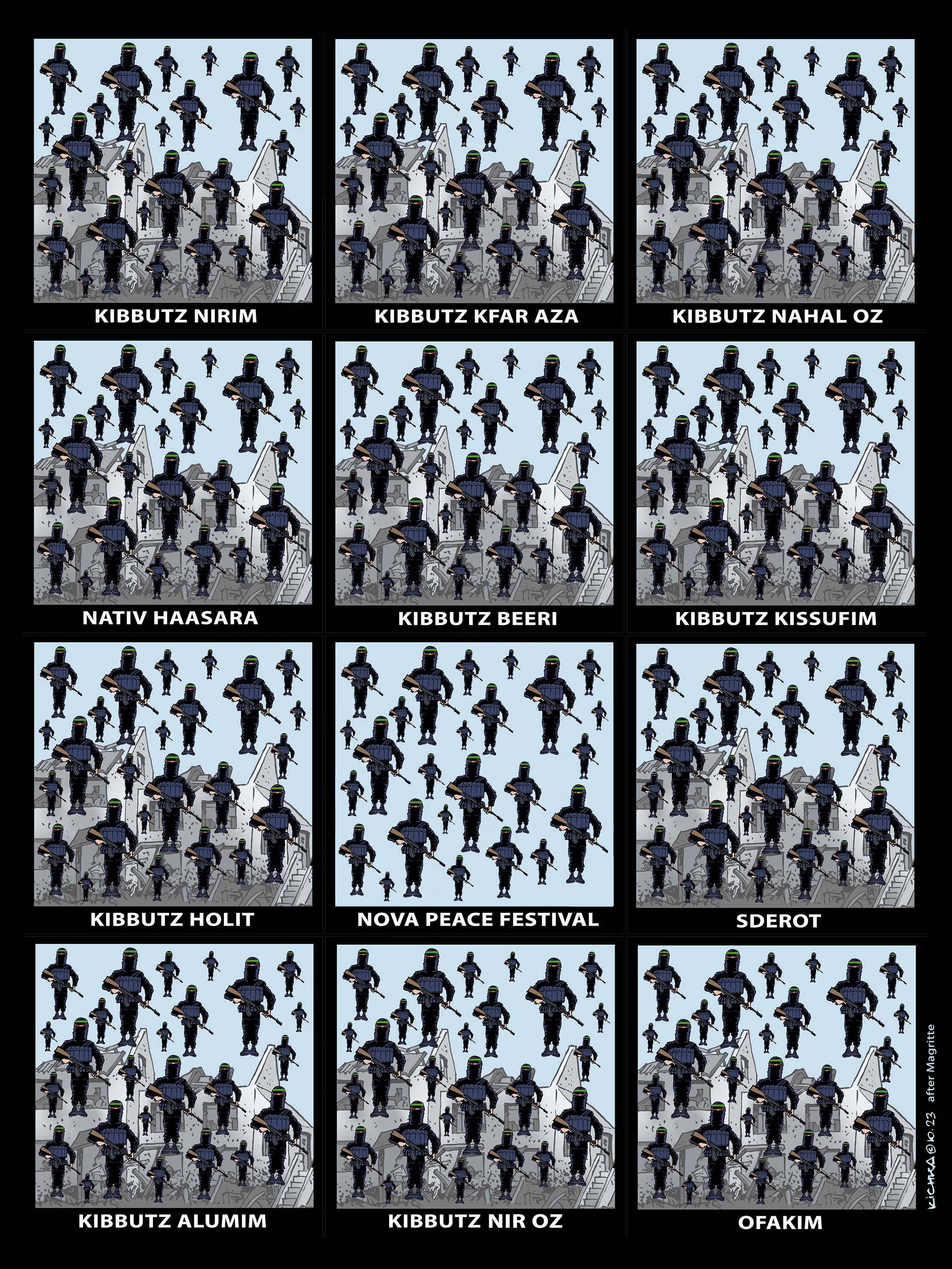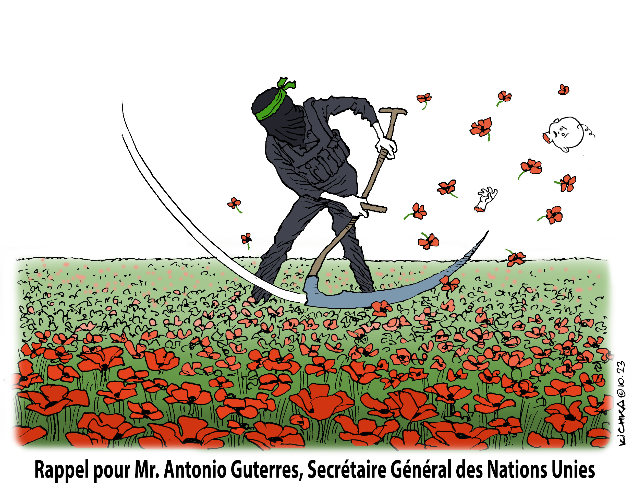 J’ajoute un petit commentaire au dessin. La région du sud d’Israel où a eu lieu le pogrom est célèbre pour la floraison des coquelicots qui a lieu chaque année entre janvier et février. Tout est recouvert d’un superbe tapis rouge que des dizaines de milliers d’israéliens viennent admirer et photographier. Le coquelicot est une fleur protégée et il est interdit de la cueillir. D’où l’idée de mon dessin. Les bébés massacrés étaient des fleurs protégées, de même que leurs familles.