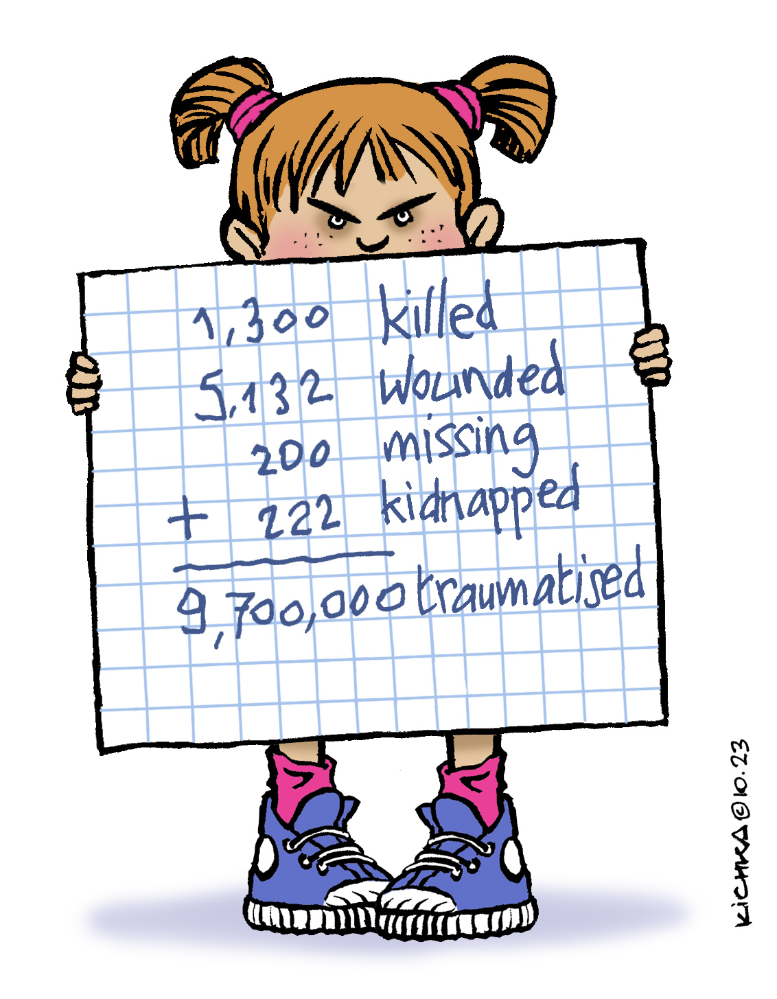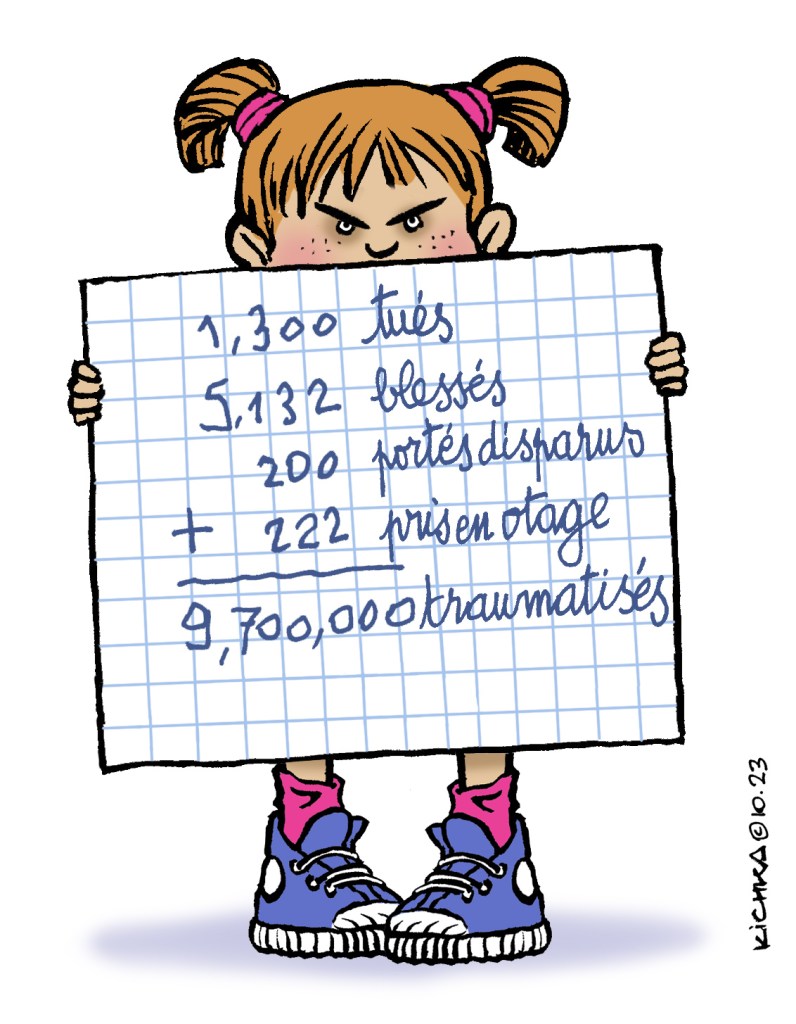 A l’heure qu’il est Israel confirme le bilan temporaire du pogrom perpétré par le Hamas le 7 octobre: 1,300 personnes sauvagement assassinées, 5,132 blessés, 100 à 200 personnes portées disparues et 222 retenues en otages à Gaza. Parmi les morts, des enfants, des bébés, des femmes enceinte, des personnes âgées dont quelques survivants de la Shoah, tous majoritairement civils hormis des policiers et des soldats, hommes, femmes, juifs, arabes et bédouins. Merci de partager l’information et mon dessin en français ou en anglais.