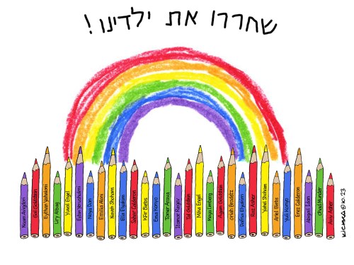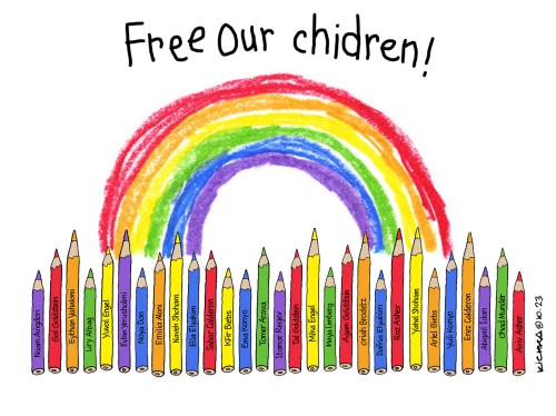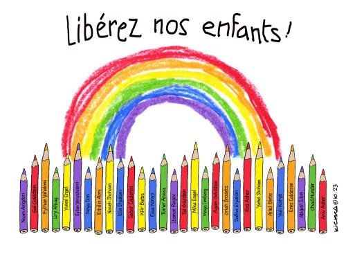 Ce n’est pas à Israel d’exiger la libération inconditionnelle des enfants. C’est au monde entier de l’exiger. Haut et fort. D’une seule voix! Ne pas le faire est cautionner le terrorisme barbare. J’ai inscrit leurs 29 noms sur les crayons de l’arc-en-ciel. A partager sans modération!