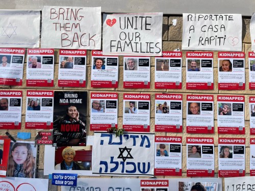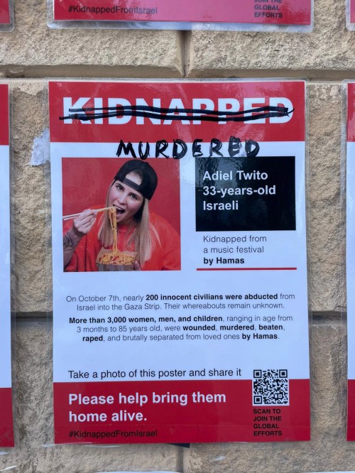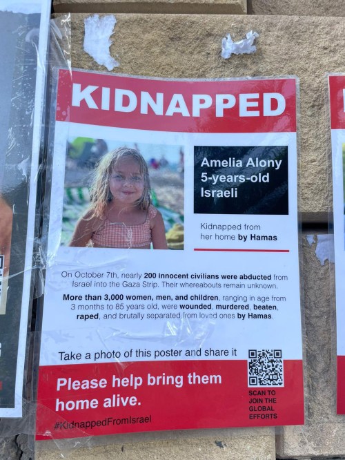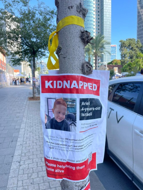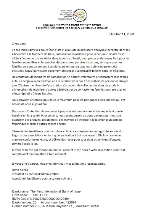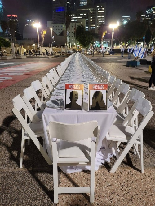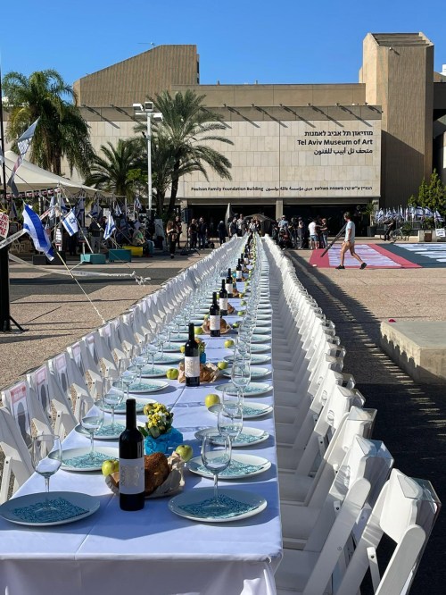 Chaque vendredi soir les familles sont réunies autour de la table pour le repas traditionnel du chabbat. Religieuses ou non, les familles célèbrent la fin de la semaine par un bon repas préparé avec amour, se rencontrent et se racontent, une merveilleuse tradition ancestrale. Hier soir, afin de marquer de façon forte l’absence des 203 otages dont nous sommes quasiment sans nouvelles, une table de chabbat a été dressée pour eux sur l’esplanade du musée de Tel Aviv. Nappe blanche, couverts, vin de kiddoush (la bénédiction), pain de chabbat (hala), fleurs, rien ne manquait. Sauf eux. Sur chaque chaise figure le nom d’un otage dont tout Israel attend le retour. Leurs photos sont également affichées dans les rues de Tel Aviv avec leur nom et leur âge. La nouvelle est tombée dans la nuit que deux otages américains ont été libérées par le Hamas, une mère et sa fille, fruit de pourparlers intensifs avec le Qatar. Cela est donc possible. Petite lueur d’espoir pour la libération future de tous les otages. Les photos sont prises par notre fils David qui je le rappelle, organise depuis deux semaines avec quelques associés et des centaines de bénévoles, un organisme qui cuisine et achemine des milliers de repas chaud et de patisseries pour les familles qui ont dû être évacuées, familles endeuillées, familles détruites, famille à la recherche de leurs disparus ou dans l’attente du retour des leurs gardés en otage à Gaza. Je redonne ci-bas les coordonnés de cet organisme pour les personnes intéressées à apporter leur soutien. Je suis choqué de voir le peu de place que consacrent les médias français à ce drame humain en Israel et ne voient que la crise humanitaires des citoyens gazaouis dont le Hamas est le premier responsable.