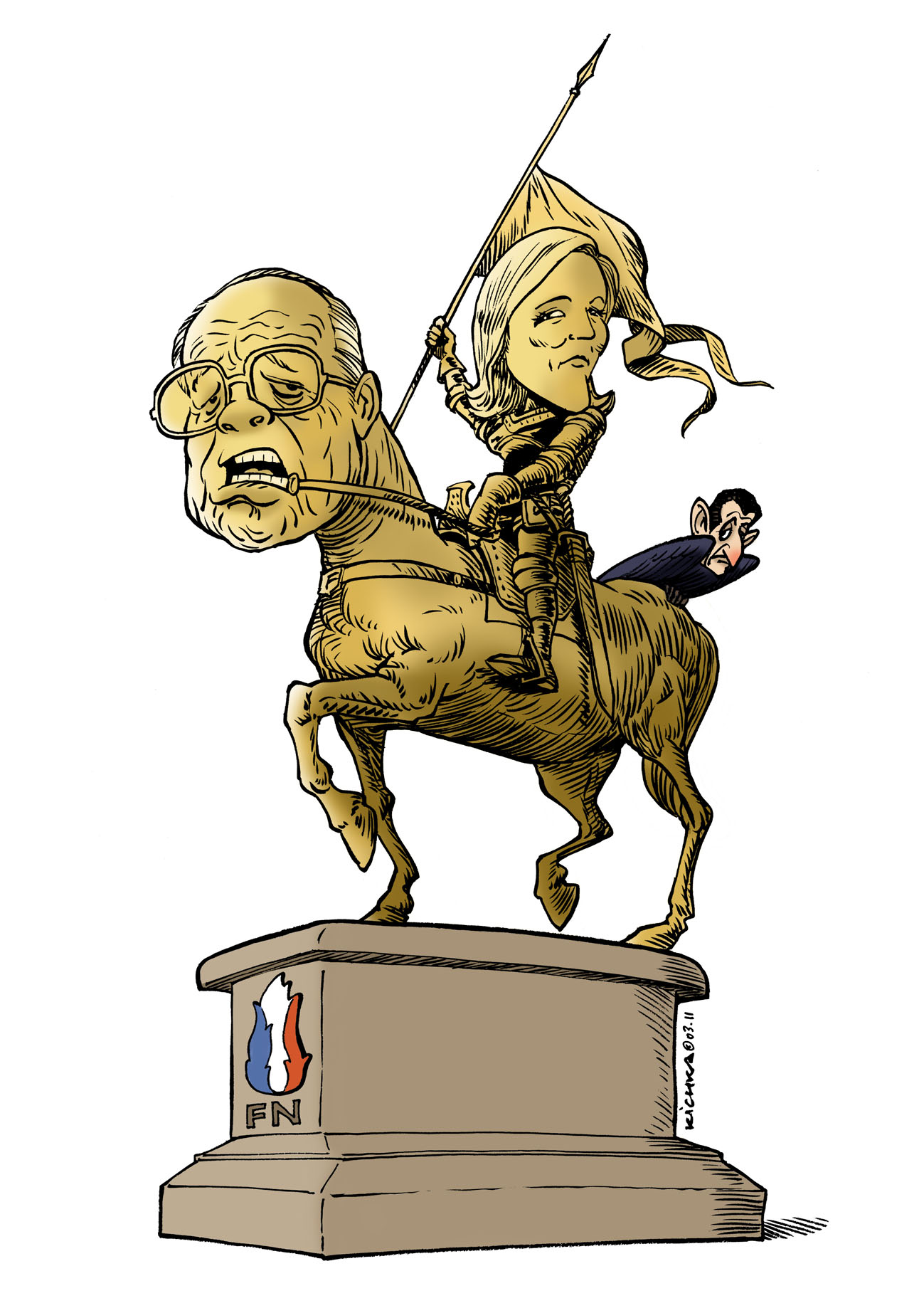 Jeanne d’Arc, l’éternelle « Pucelle » n’est pas rentrée dans l’histoire comme objet sexuel mais elle est aujourd’hui l’objet d’une récupération politique pathétique. Née le 6 janvier 1412, elle se voit courtisée avec ardeur par les candidats à la présidentielle qui veulent souffler les 600 bougies et se faire la grosse part du gâteau. Aujourd’hui à Domrémy, demain à Paris, l’UMP et le FN se l’arrachent. Si seulement elle le pouvait, elle leur enverrai, soit en texto soit sur facebook, un énorme « Dégage! » en lettres majuscules! Je me rends compte qu’en Mars dernier, au moment de la passation des pouvoirs dans la famille Le Pen, j’ai fait ce dessin prémonitoire.