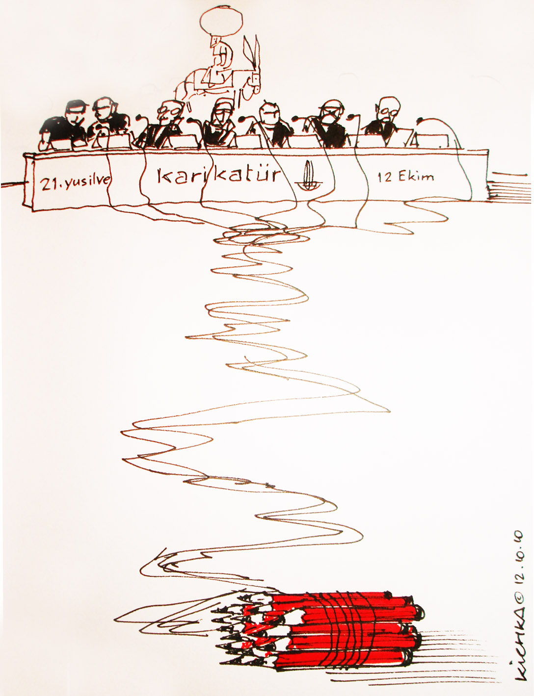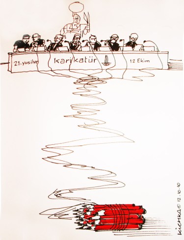 Dessin réalisé lors d’une conférence-débat sur l’interprétation des dessins de presse au premier et second degré, sur la globalisation comme phénomène nouveau dans la circulation des dessins et des idées, sur les nouveaux challenges auxquels les dessinateurs doivent faire face,…
