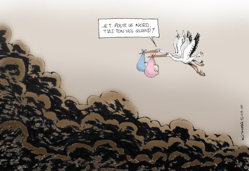 Alors que le nuage avance de l’Islande vers le reste de l’Europe, naît ma petite-fille Emilie. Alors n’allez pas vous étonner que je mette de cigognes dans mon dessin.