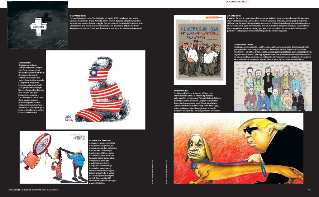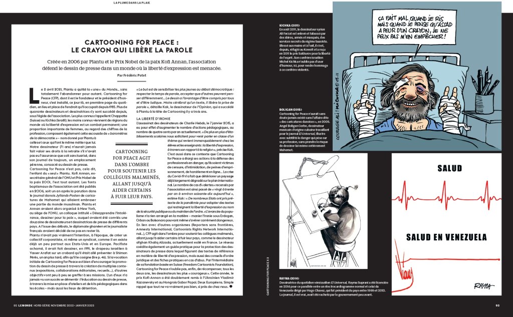 Belle publication de Cartooning for Peace sur son action en faveur de cartoonsites malmenés un peu partout dans le monde mais surtout dans les régimes non démocratiques et sur la force des dessins avec un zeste d’humour dans l’éveil des conscience.