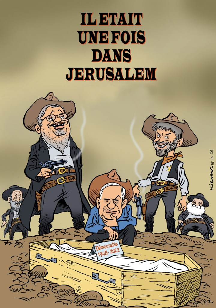 Le gouvernement qui se concocte va dessiner un autre Israel. On ne va pas rigoler ici dans les années à venir avec la majorité nationaliste qui va de la droite à l’extrême droite, des orthodoxes aux ultra-orthodoxes, des illuminés aux obscurantistes, des partisans des colonies aux colons sauvages, des anti-démocratiques aux anti-laïques, des bouffeurs d’arabes aux bouffeurs de gauchistes, des opportunistes aux populistes, des nostalgiques de la Loi Biblique aux ennemis de l’État de Droit, des détracteurs de la Cour Suprême aux habitués de la corruption, des obsédés de la suprématie juive aux racistes et aux homophobes, des fous du Grand Israel aux fanatiques du Troisième Temple.