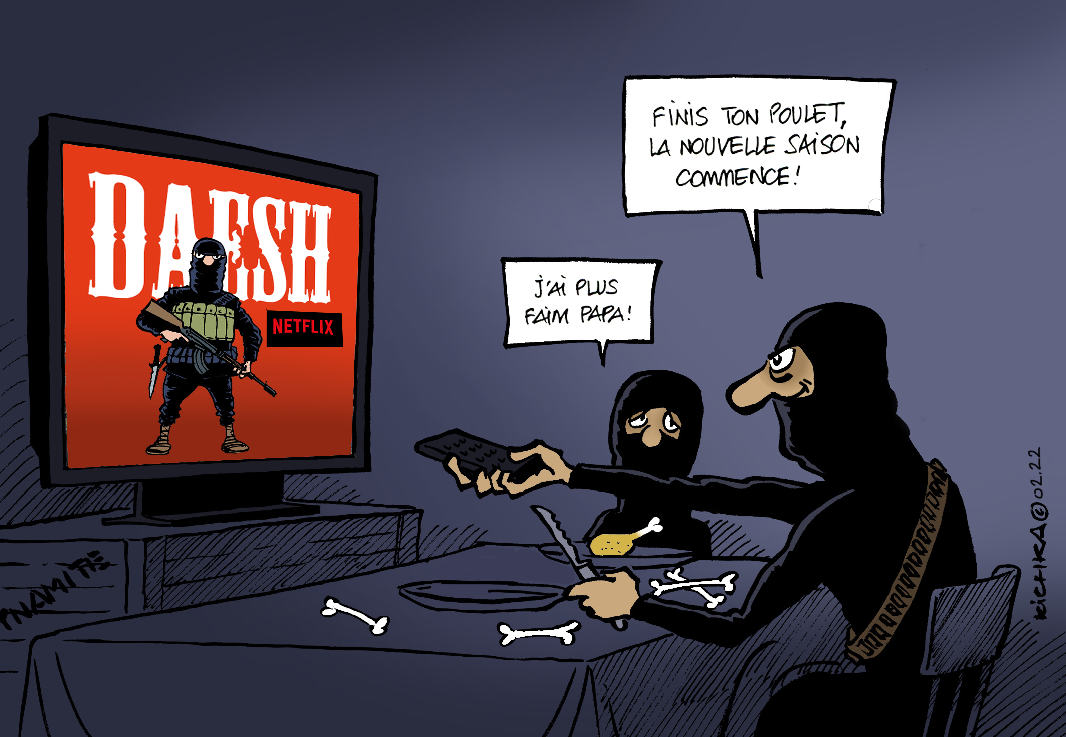 Quand Ben Laden fut liquidé j’ai réalisé ce dessin. Je pourrai faire le mème aujourd’hui en remplaçant Obama par Biden et la tête de Ben Laden par celle d’Abou Ibrahim. Mais j’ai choisi d’en faire un autre.