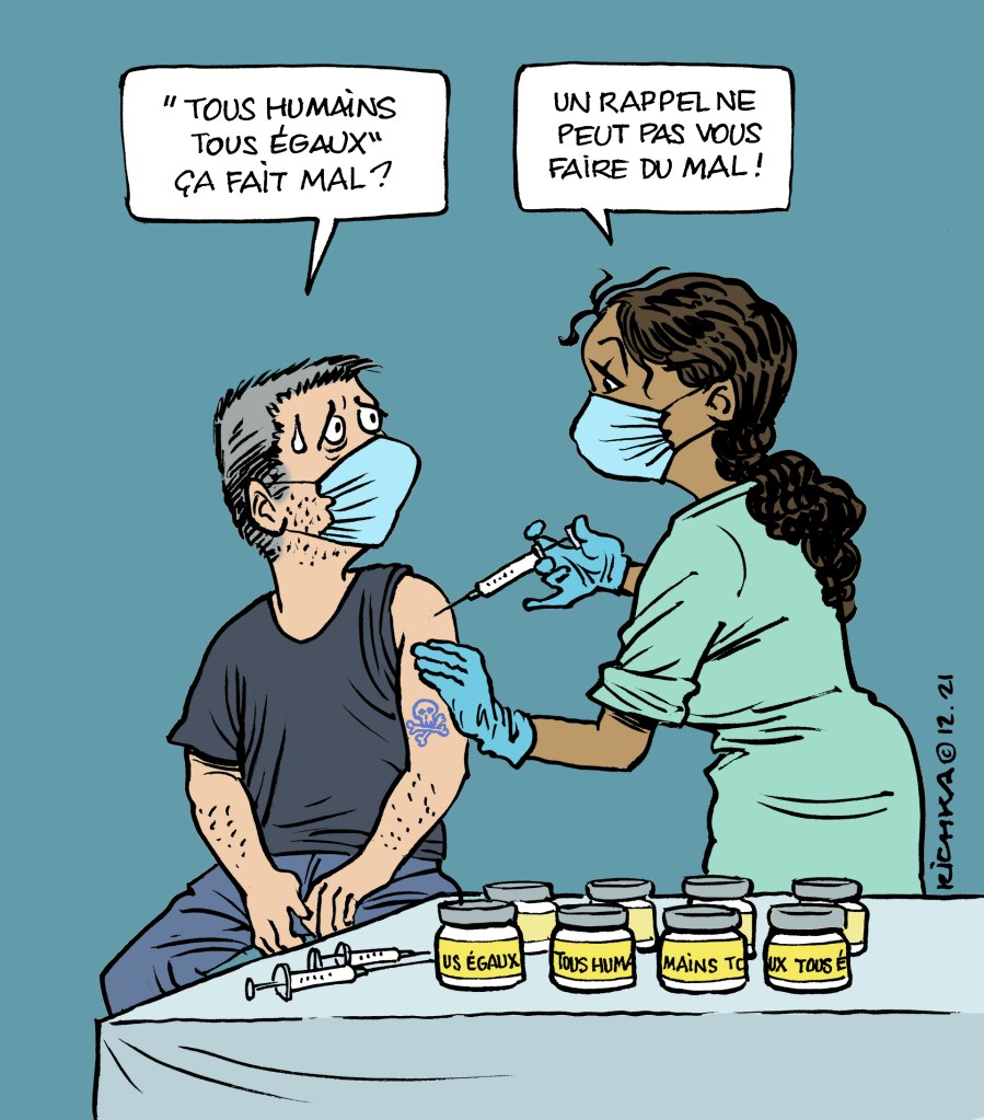 Le 10 Décembre est la Journée des Droits de l’Homme. Les principes d’égalité et de non-discrimination qui sont au coeur de la Déclaration Universelle des Droits de l’Homme et de la Femme sont encore loin d’être évidents pour tous. Une charte déclarative c’est bien mais c’est peu. Une journée annuelle consacrée à ces droits c’est bien peu. Le slogan choisi par les Nations Unies cette année est « Tous humains, tous égaux ». Un dessin aussi c’est bien peu, mais j’en ai quand même fait un. Un petit sourire ce n’est pas rien!