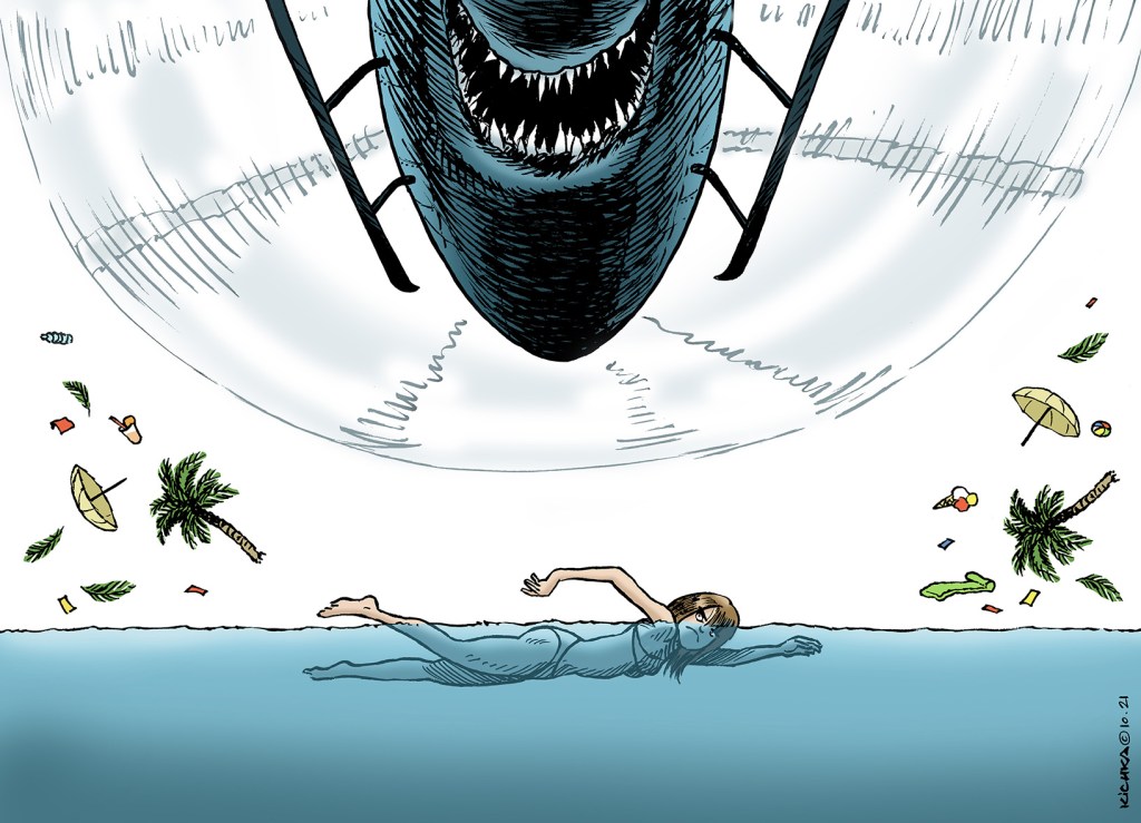Voici mon dessin. J’y fait référence à l’affiche du célèbre film « Les dents de la mer » en inversant le sens de la menace qui vient, cette fois-ci, du ciel!