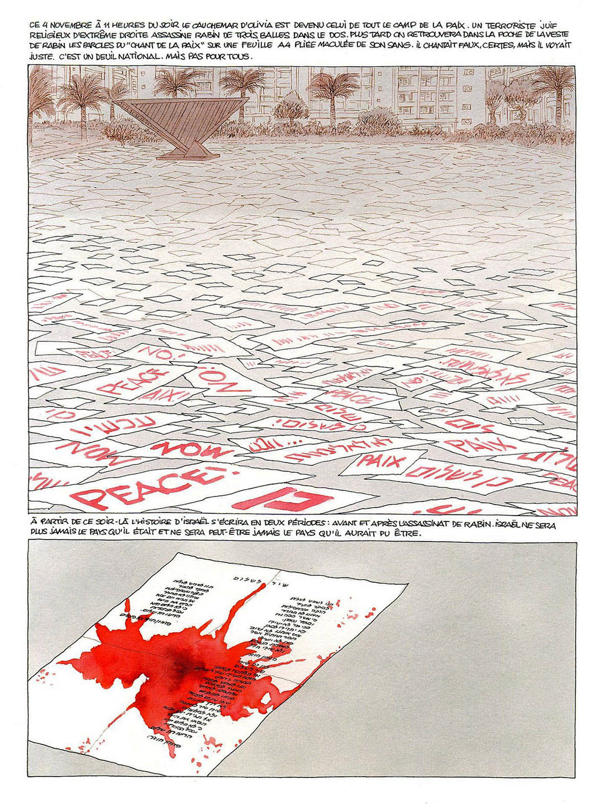 L’assassinat d’Ytzhak Rabin il y a 24 ans a totalement changé le pays, il l’a défiguré. Le sang de Rabin refuse de sécher. Dessiner la page de la nuit du 4 Novembre 1995 dans Falafel sauce piquante me fut très pénible. Je refuse d’accepter la situation, je refuse de baisser les bras, je refuse de perdre l’espoir pour avenir meilleur dans toute la région, pour nous et nos voisins.